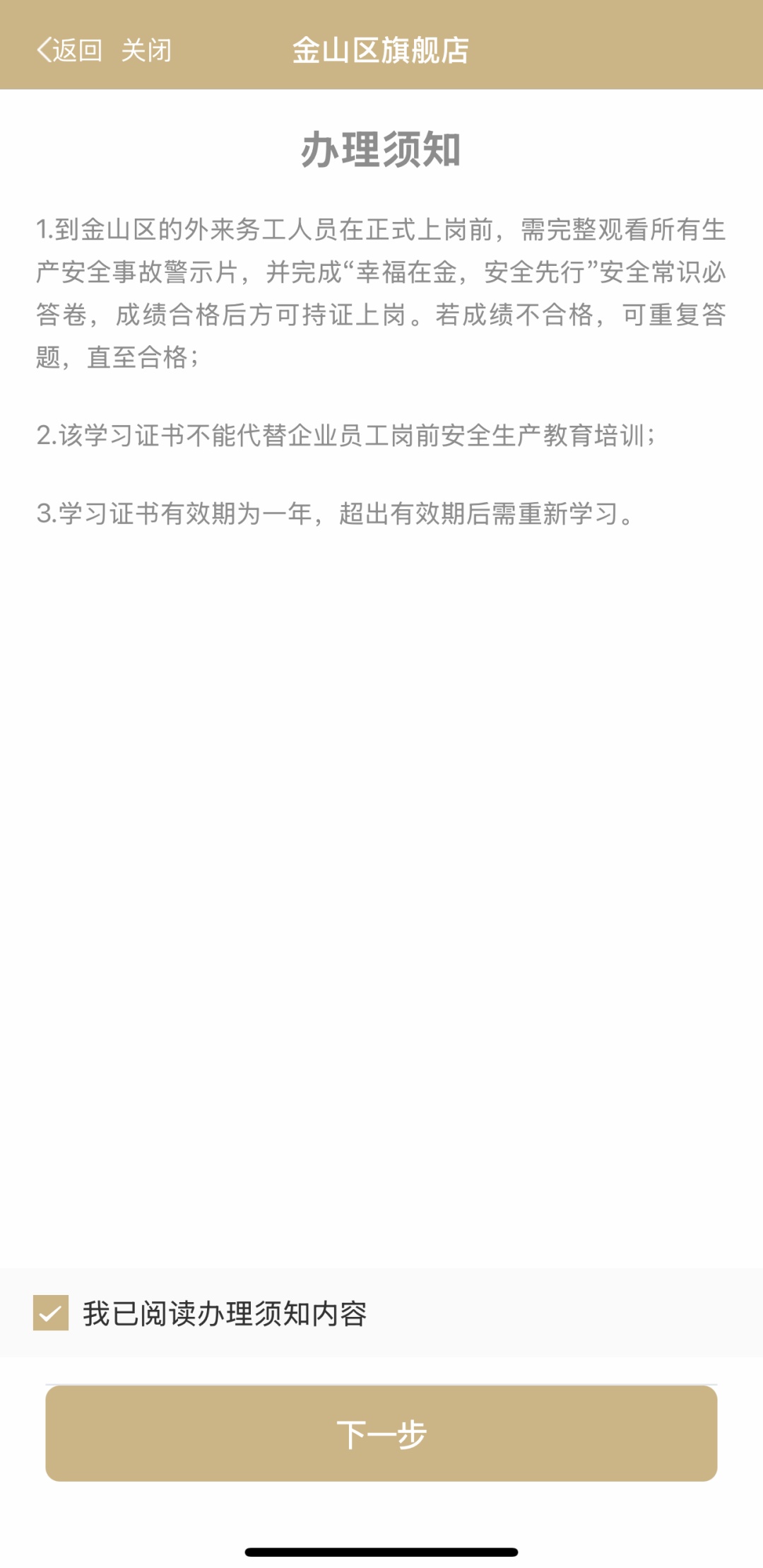 近日,在2024上海“一网通办”经典案例评选中,金山区申报的“来金第一课”应用服务案例荣获申智创新·智办创新奖。 案例分享 金山区政务服务中心围绕“金心办 尽心办”这一工作主线,重点聚焦政务服务创新领域工作,与区应急管理局联动,在“随申办”市民云金山区旗舰店推出“来金第一课”应用服务,提高来金务工人员安全生产意识和知识水平。 ←安全上岗证