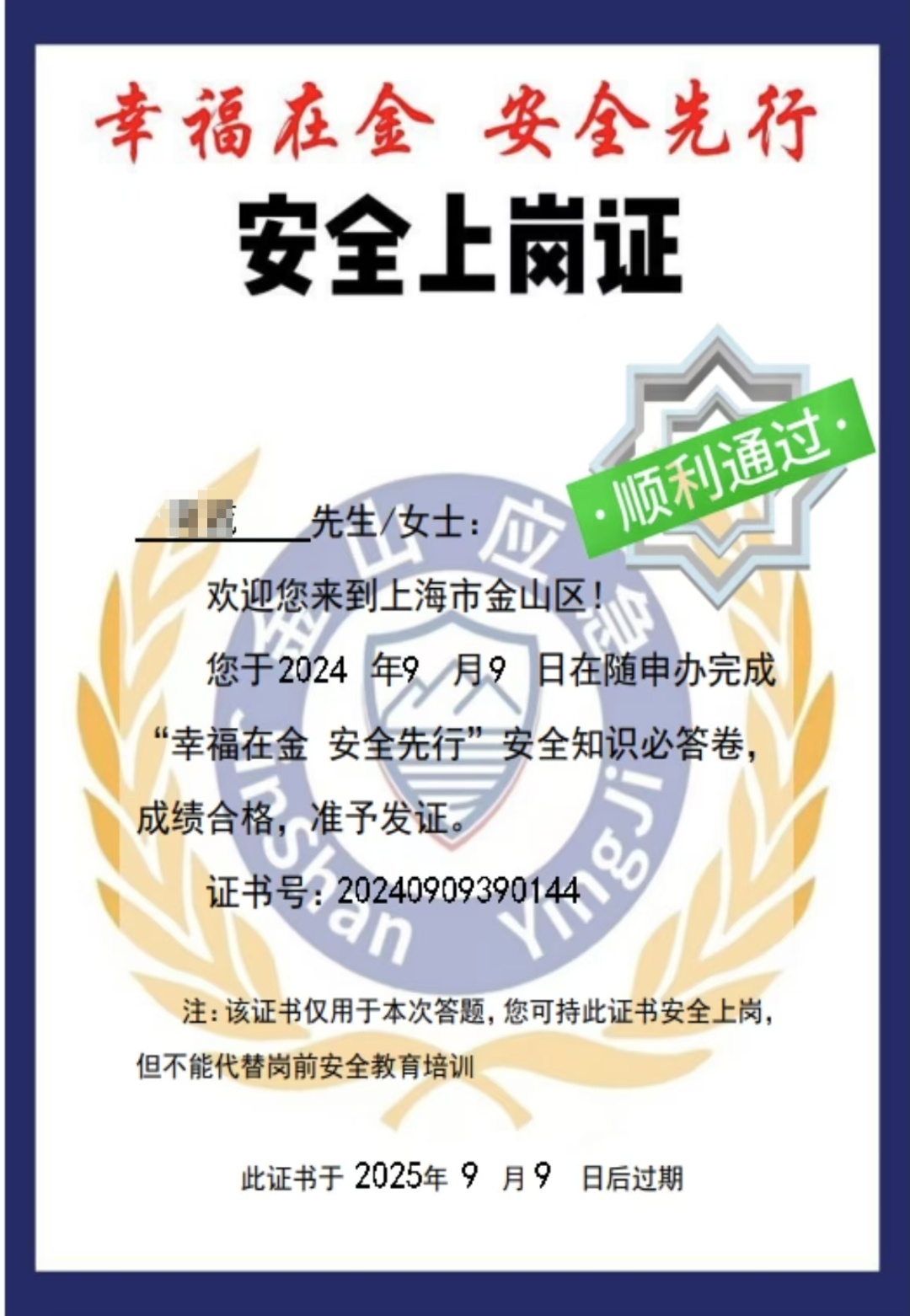 区应急管理局结合金山安全生产情况,制作了专属安全教育警示视频,来金务工人员通过在线观看安全教育视频、在线测试,达到合格标准后便可获得“安全上岗证”电子凭证。这一流程变革,从以往区应急管理局工作人员通过“线下跑腿”进行安全宣传教育,转变为来金务工人员自主“网上自助学习”的新模式,让线上平台发挥“大作用”,切实筑起一道“岗前安全意识堤坝”。目前已累计学习培训7万余人。