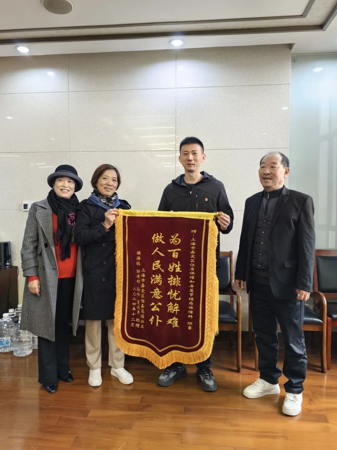 2024年12月4日上午,家住嘉定区江桥镇某小区的侯先生等4户居民,将一面“为百姓排忧解难、做人民满意公仆”的锦旗送到了嘉定区房管局,感谢该局保障科顾睿同志的帮助,让他们完成了购买公房的愿望。