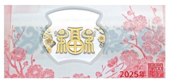 票面正面国徽、“ 中国人民银行”行名、篆书“蛇”字印章、 蛇的造型图案、汉字“贰拾圆”、盲文面额标记,票面背面面额数 字“20”、汉语拼音字母“YUAN”、儿童贴春联图案、年号“2025年”、行长章、“中国人民银行”汉语拼音字母和蒙、藏、维、壮 四种民族文字的“中国人民银行 贰拾圆”字样等均采用雕刻凹版 印刷,触摸有凹凸感。(五)双色铜合金纪念币和纪念钞与现行流通人民币职能相同,与同面额人民币等值流通。该套金银纪念币正面图案均为中国传统吉祥纹饰组合图案,并刊国名、年号。