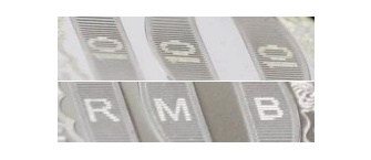 将硬币倾斜适当角度,可在正面面额数字“10”的轮廓线内,观察到两组由3个“10”和“RMB”构成的隐形图文。防伪特征效果见图3。图3 隐形图文效果示意图