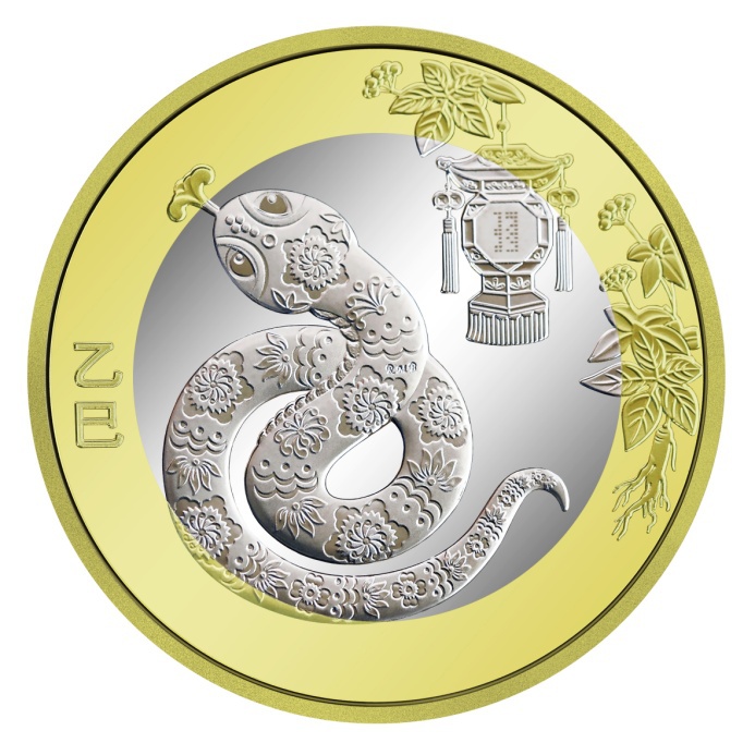 双色铜合金纪念币背面图案为中国传统剪纸艺术与装饰年画元素相结合的蛇形象,衬以花灯和人参图案,币面左侧刊“乙巳”字样。