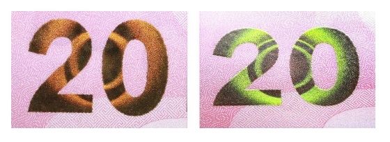 位于票面正面左侧。改变观察角度,面额数字“20” 的颜色 在金色和绿色之间变化,并可见圆形光环效果。防伪特征效果见图8。