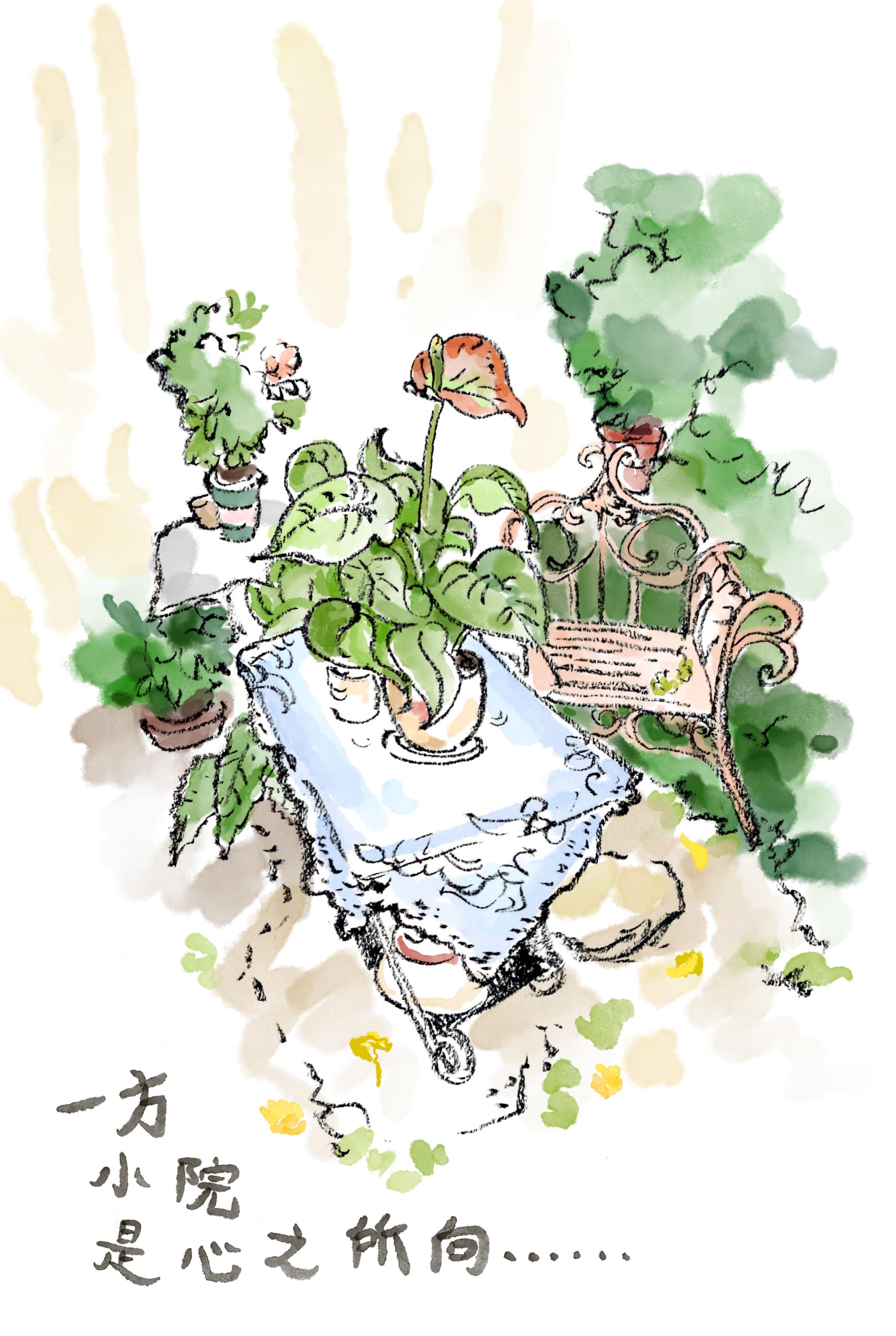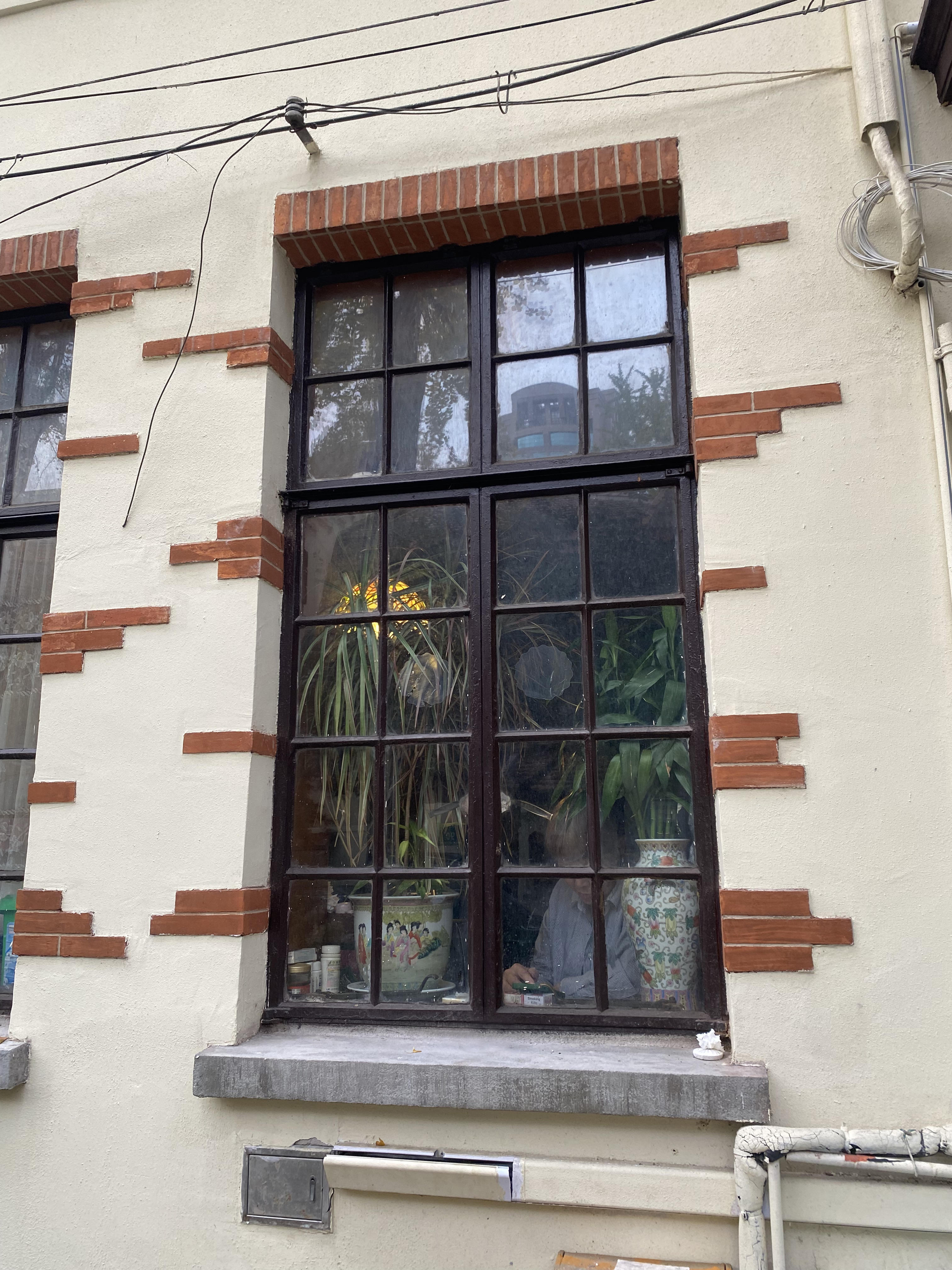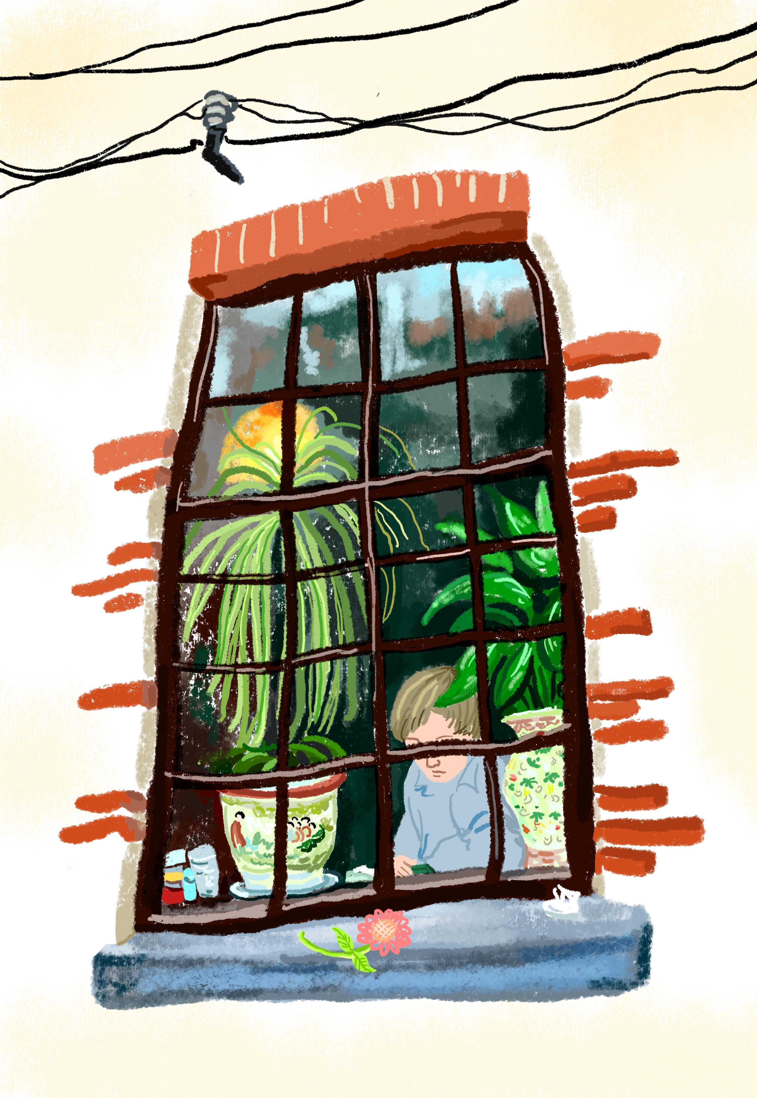 窗内的小世界似乎也很缤纷精彩,有粉彩花瓶也有高大的绿叶。窗前低头的女生不知道是在思考什么人生难题。