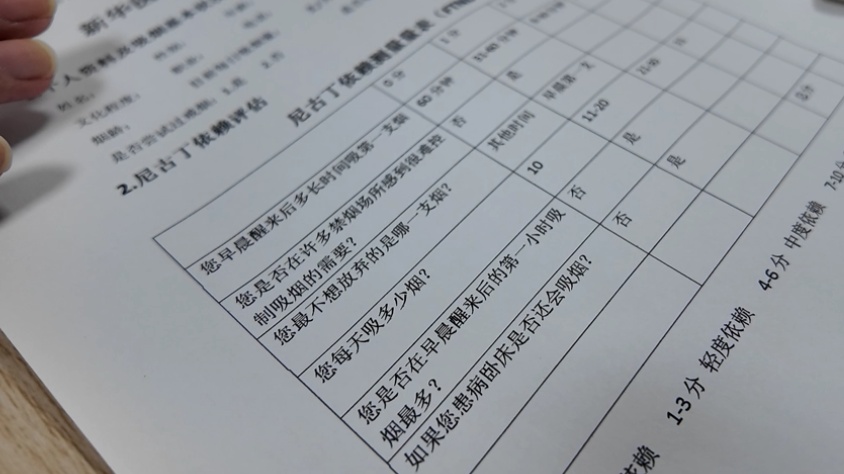 小黄来到戒烟门诊后,医生首先评估其烟瘾程度,同时对戒烟意愿进行评估。再根据个体的情况制定相应的治疗方案,并与吸烟者签订戒烟承诺书,让吸烟者有戒烟“仪式感”。上海健康医学院附属崇明医院呼吸内科副主任邓桂胜说:“了解了吸烟者的基本情况以后,会让他填写一个量表,来看看吸烟者对尼古丁的依赖程度。依赖程度为轻度或中度的,都是可以通过自我约束达到戒烟效果的,而重度依赖,则需要使用药物进行辅助。”