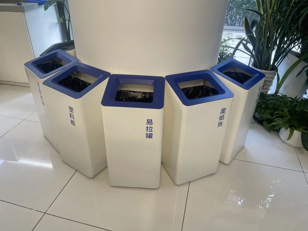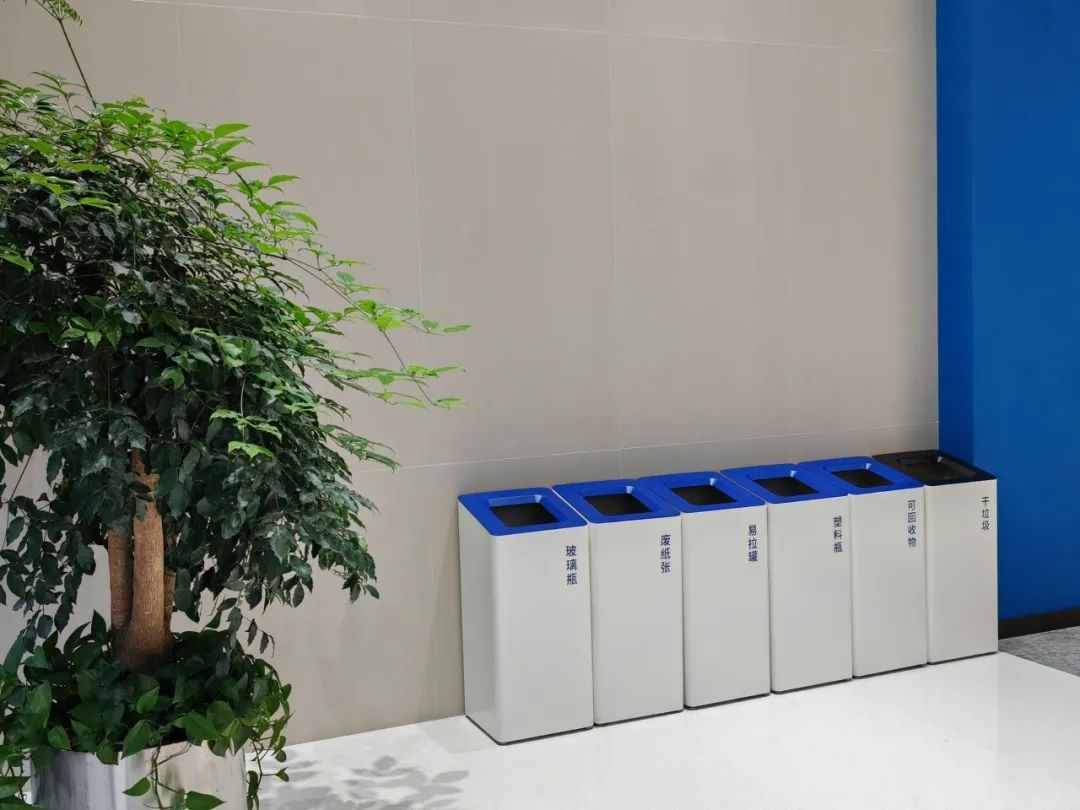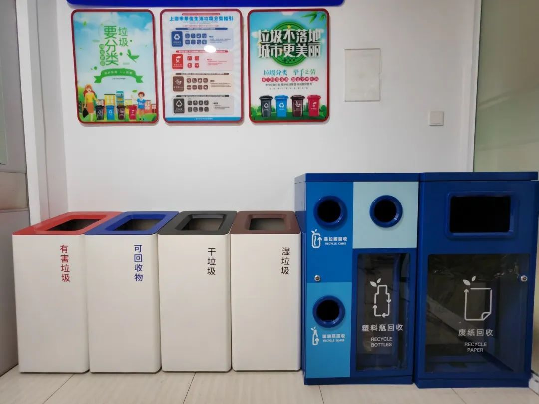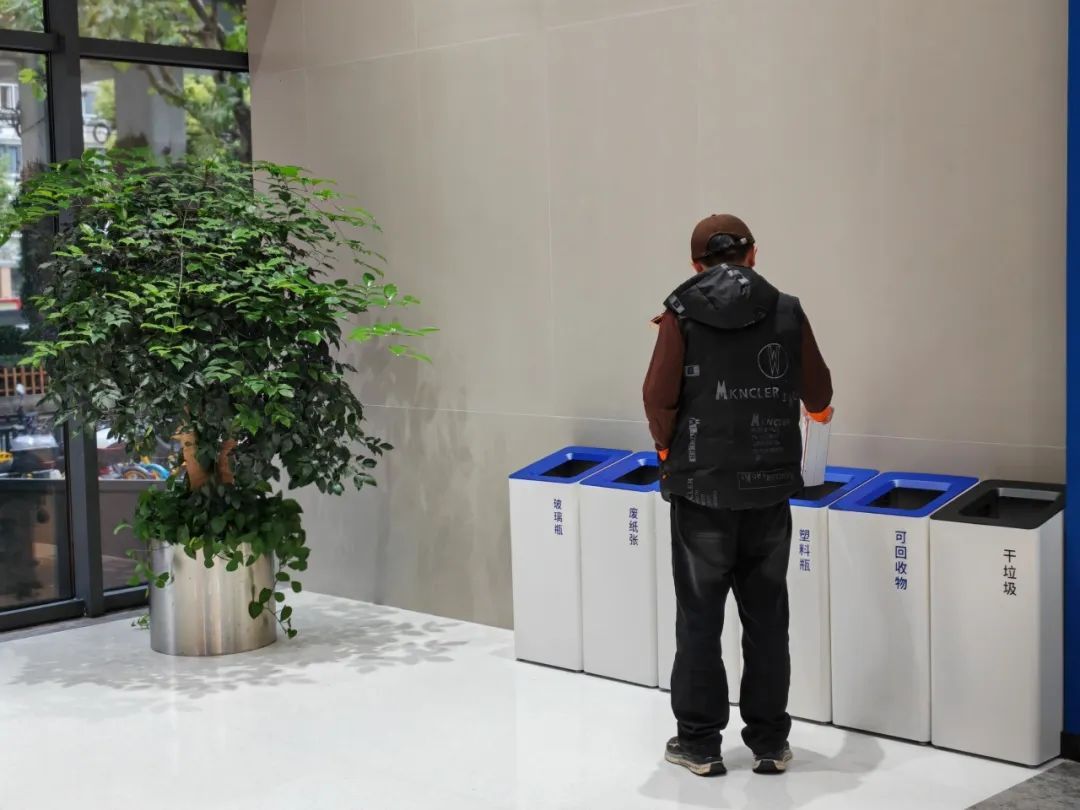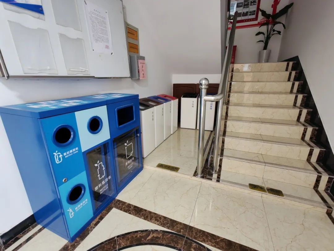 以止园路的圣骊园区为例,除保持垃圾箱房的分类不变外,参照机关事业办公点标准,在大堂内醒目地设置了一排可回收物精细化分类废物箱,绿色环保、干净整齐。