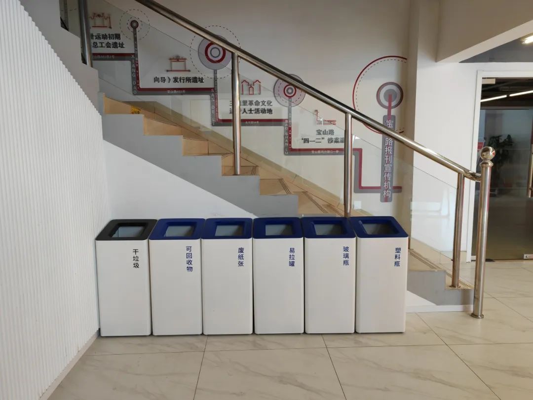 宝山路街道在机关事业办公点(街道办事处、社区党群服务中心、经济发展服务中心、城市运行服务中心等)和商务办公园区(汇通园区、圣骊园区等)原有生活垃圾精细化管理的基础上,将其变身为简洁素雅的“八分类”垃圾箱(桶),通过增设日常使用频次较高的瓶罐、纸张专门投放口,提高分类收集效率,进一步促进垃圾分类实效提升。