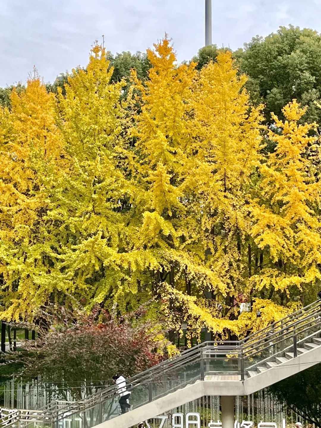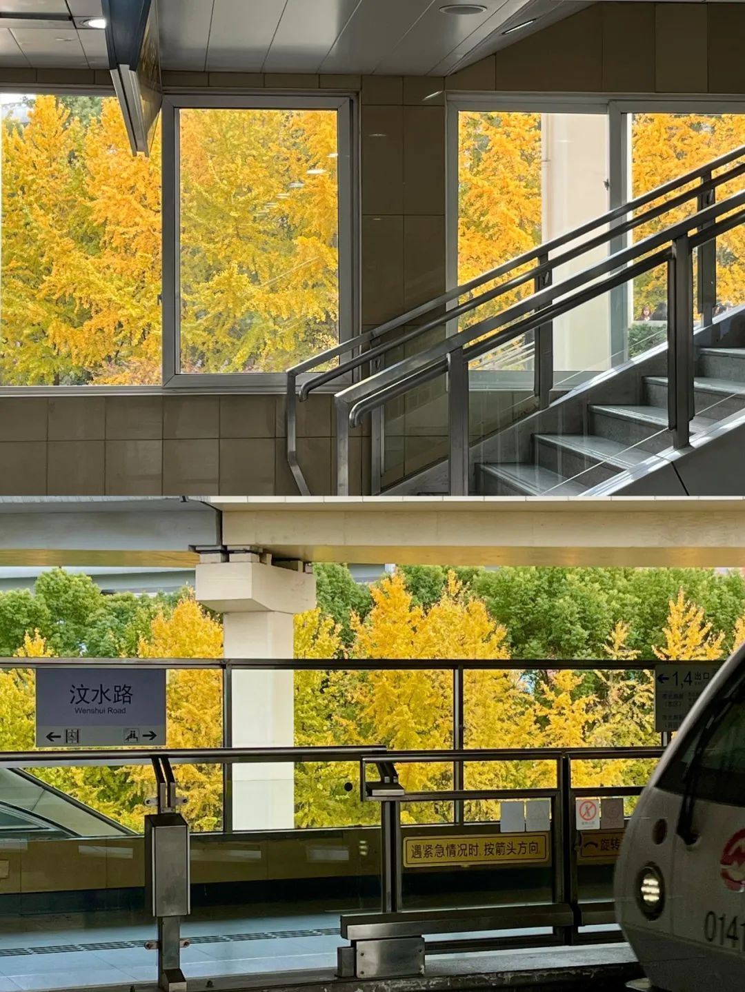打卡机位不仅有站外的人行天桥,在等车时的站台、出站前的窗口,随处都可以邂逅电影画面般浪漫的银杏,更多机位等待你的发现。