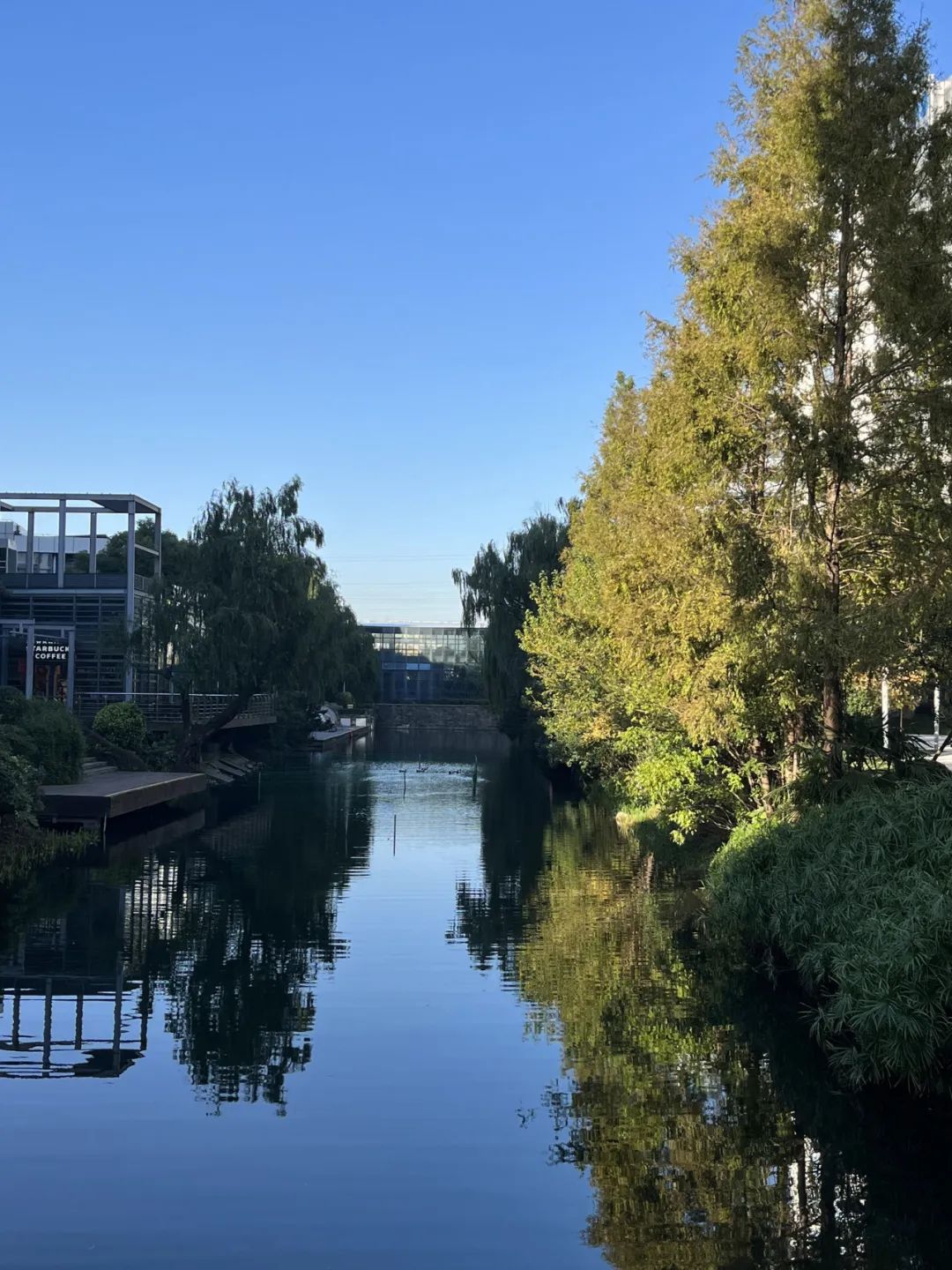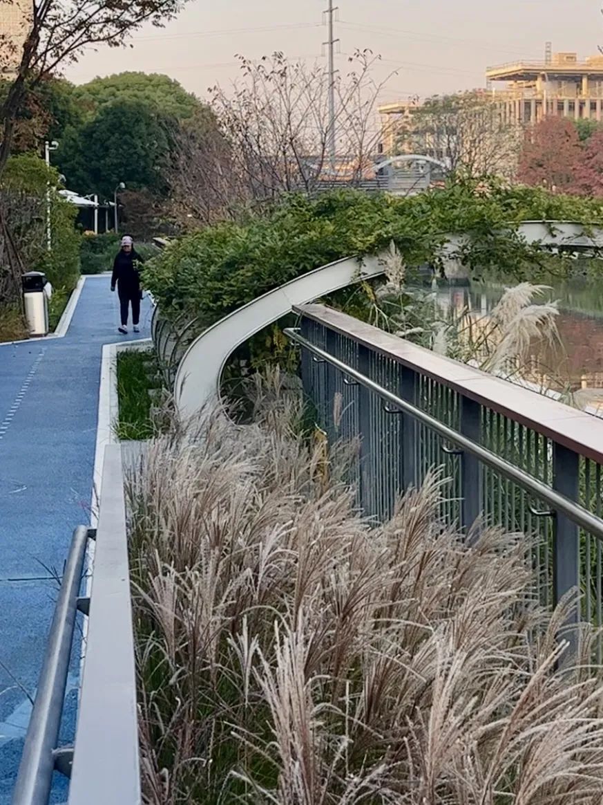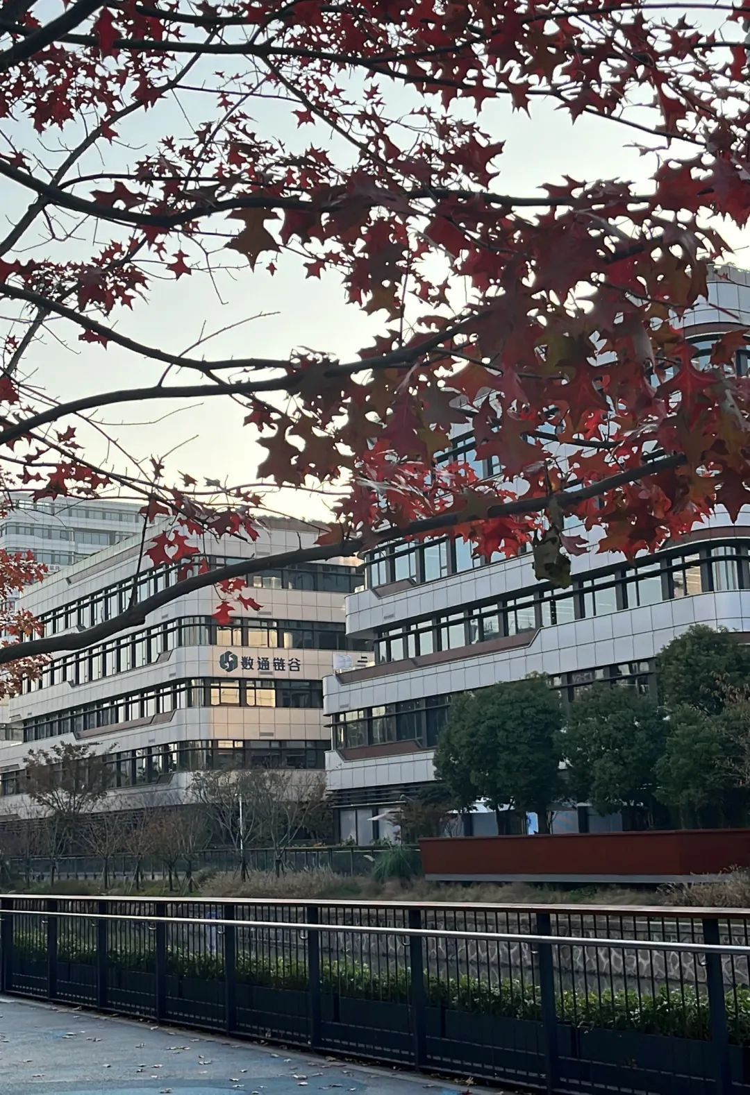园区里,银杏、水杉、悬铃木、红花槭等树种层林尽染,绽放出斑斓的秋色。阳光晴好的天气,漫步于数通链谷旁的彭越浦河畔,足不出园区即赏烂漫秋色,惬意十足。