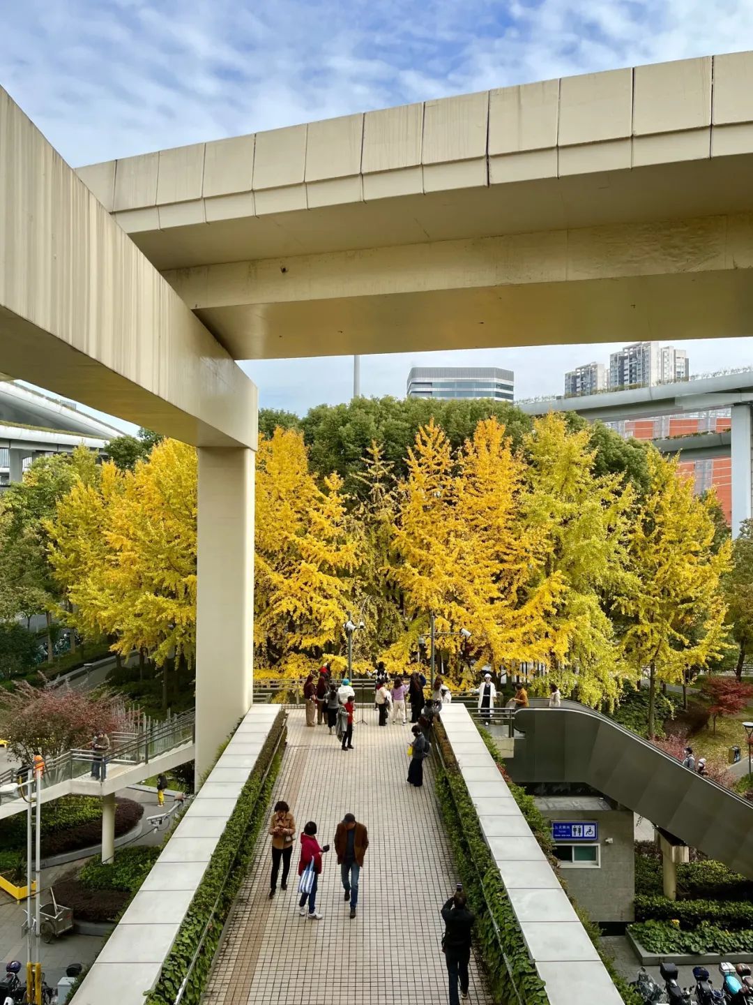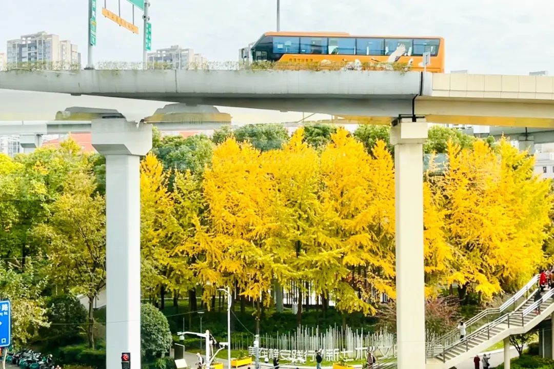 想要拍出人物与高大挺拔的银杏树同框的照片,往往需要一些技巧,不过在汶水路站,出口处的人行天桥缩小了人与站外银杏林的高度差,形成了一个巧妙的银杏观景平台,让人们穿梭于都市的繁忙之余,可以在此驻足,欣赏银杏叶随风轻舞,拍下一张定格美好的照片。