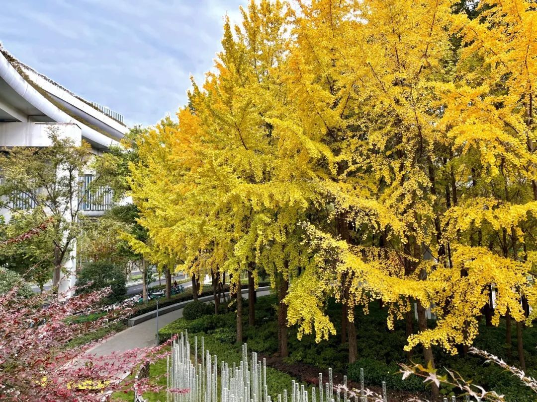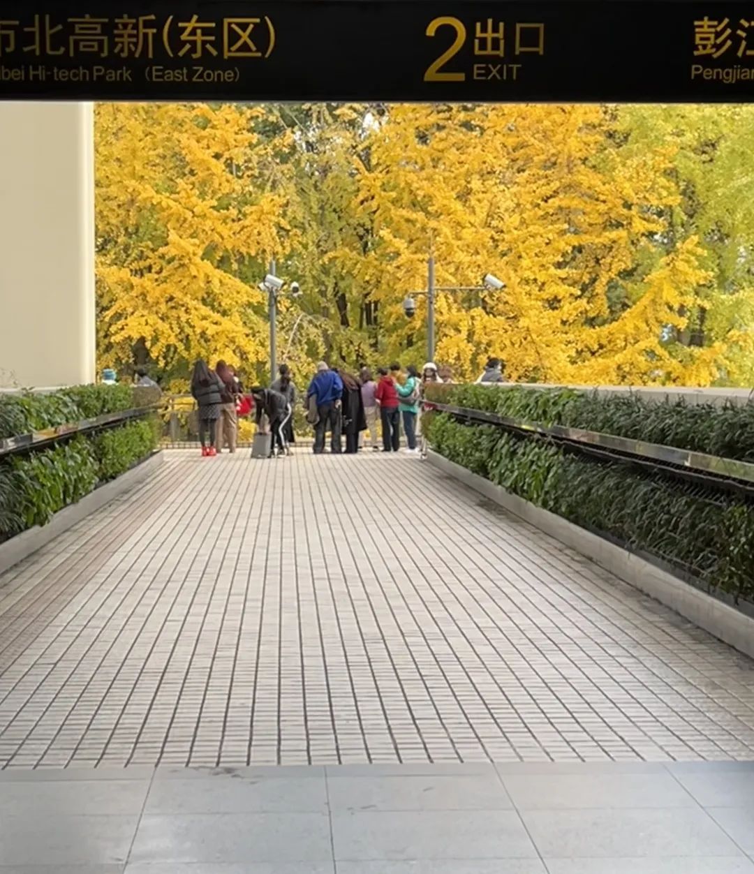 如今,时间施加“魔法”,站外成片的银杏林已是满目金色。站在车站2号口,目光所及,耀眼的银杏给视线加上了一层温暖的滤镜,走出通道,宛如步入了一个金色的童话世界。