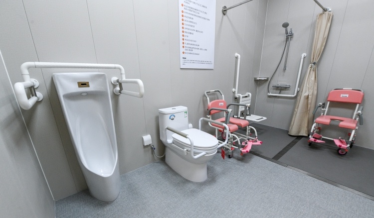 嵌入社区的适老化改造样板间展示了以排水槽、浴帘代替传统挡水条