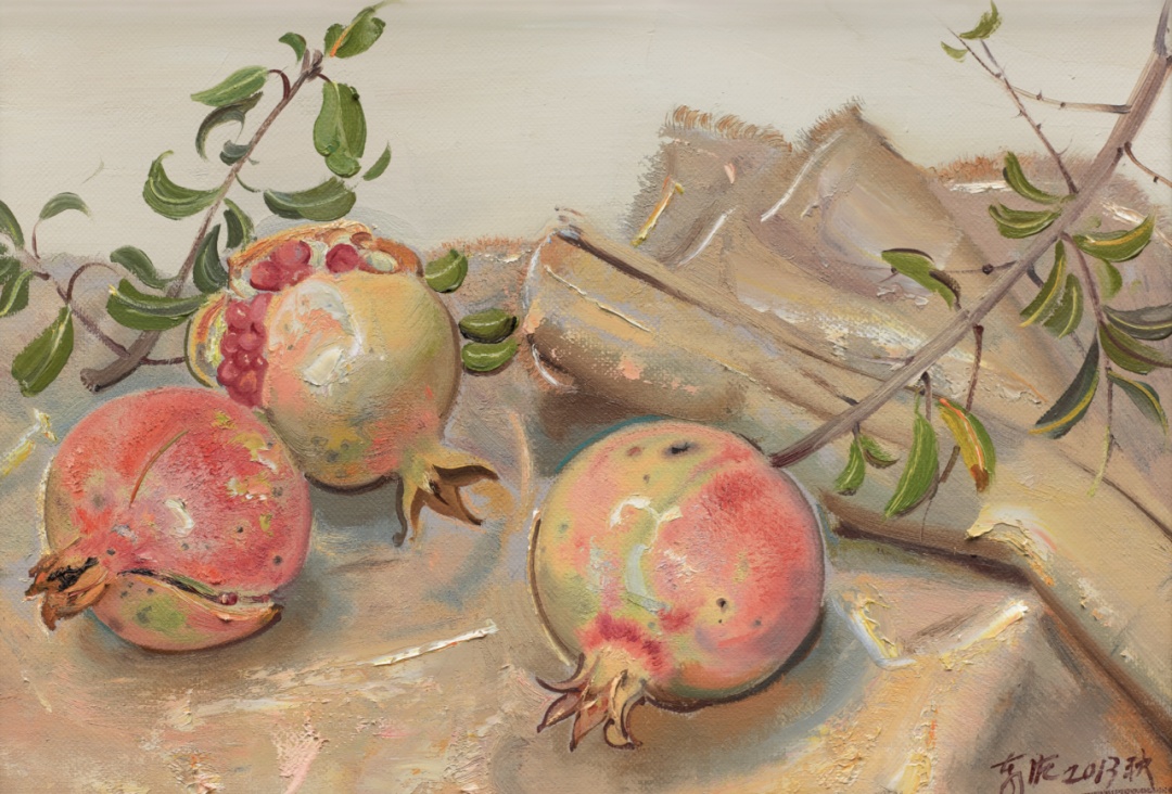 画中的石榴就是庭院里的果实,树来自山东友人新伟,千里迢迢运来北京,大吊车举着树由空中扶摇而至,并排排种下两棵。于是五月榴花红,十月果初成,东旺画下了她们的成熟和喜悦。