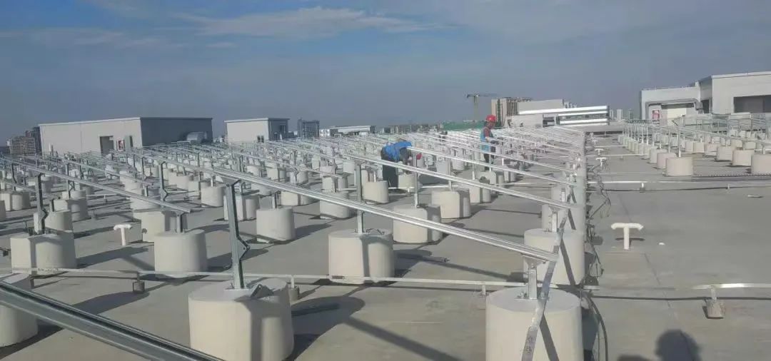 考虑到要尽量减少跨接情况,中来智联采取了光伏组件区块化排布,既节省了直流电缆,又做到了规整、美观。另一方面,项目适当缩短了组件间距,在保证光伏电站基础发电效率时,也方便企业多元化利用屋面空间。以混凝土墩作为光伏支架基础,在其上安装光伏板,可有效保护已有的混凝土屋面,避免因新建光伏阵列可能造成的屋面漏水情况,同时又起到降低屋面温度的作用。