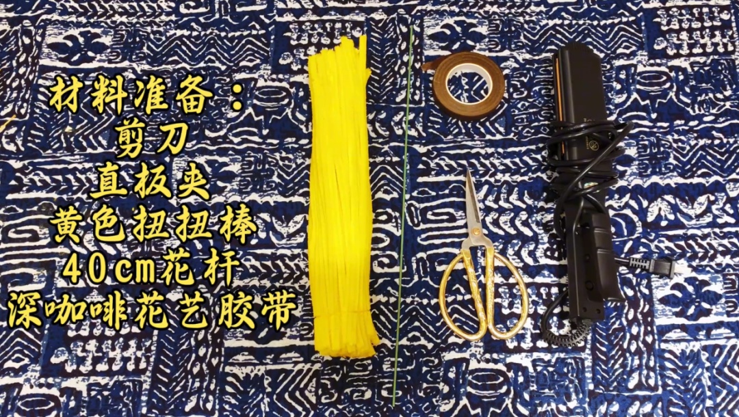 剪刀、直板夹、黄色扭扭棒、40厘米花杆、深咖啡花艺胶带