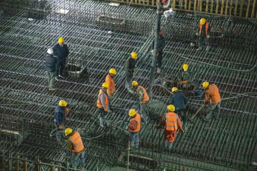 为保证大体积混凝土一次浇筑完成,项目部在现场配置2台泵车、8台混凝土罐车,按照纵向分段、分层浇筑,同时安排技术和测量人员全程跟踪监控,保障施工质量。