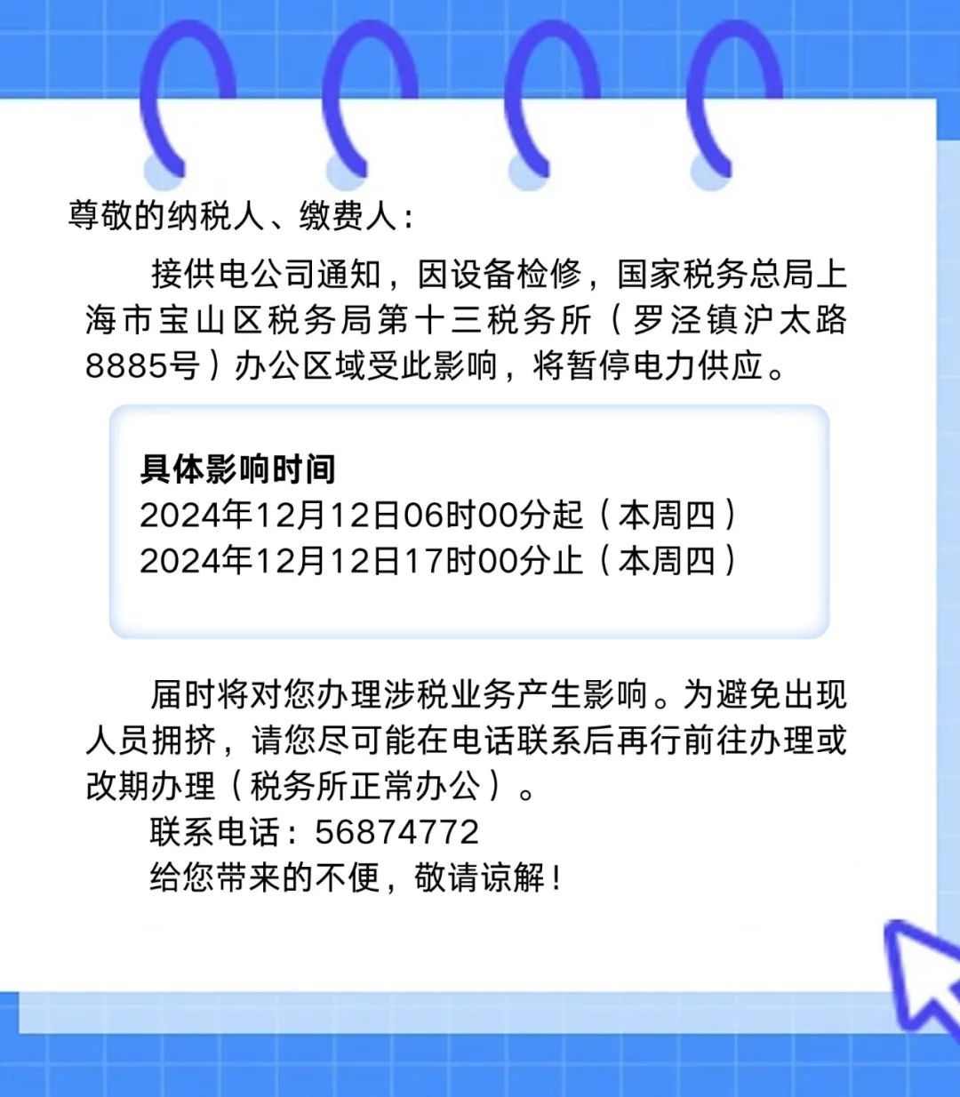 【提示】明日6时-17时,宝山区税务局第十三税务所因停电检修,相关涉税业务暂停
