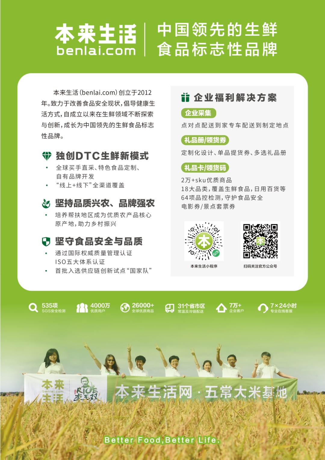 本来生活网(www.benlai.com)于2012年在北京正式起航,是中国领先的生鲜电商品牌,为超10万家企业提供定制化员工福利、商务礼品解决方案。坚守品质12年,获得政府、行业广泛认可。自成立以来,陆续在上海、广州、深圳等中心城市开设分部。配送覆盖全国超300个城市。
