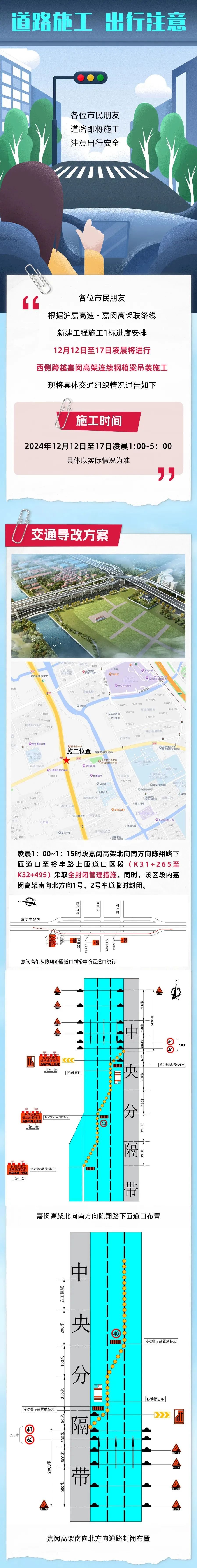 据市交通委指挥中心介绍,根据沪嘉高速—嘉闵高架联络线新建工程施工1标进度安排,12月12日至17日凌晨将进行西侧跨越嘉闵高架连续钢箱梁吊装施工。具体交通组织情况如下↓