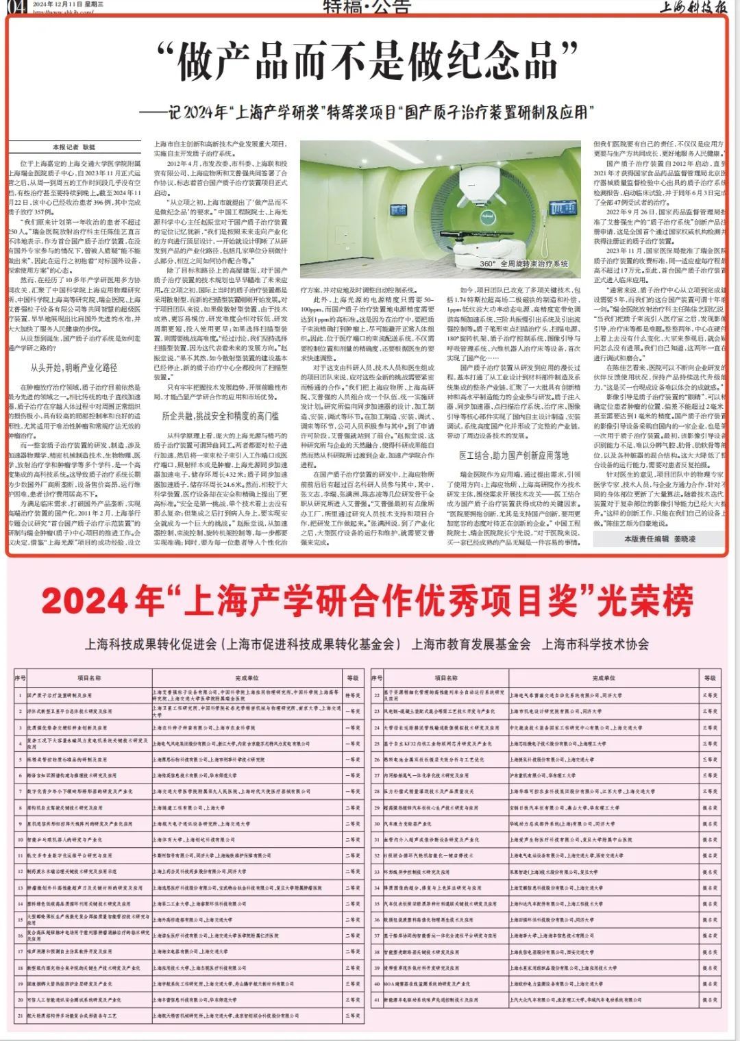 瑞金医院作为应用端,通过提出需求,引领了使用方向;上海应物所、上海高研院作为技术研发主体,围绕需求开展技术攻关——医工结合成为国产质子治疗装置获得成功的关键因素。“医院要拥抱创新,尤其是支持国产创新,要用更加宽容的态度对待正在创新的企业。” 中国工程院院士、瑞金医院院长宁光说,“对于医院来说,买一套已经成熟的产品无疑是一件容易的事情。但我们医院要有自己的责任,不仅仅是应用方,更要与生产方共同成长,更好地服务人民健康。”
