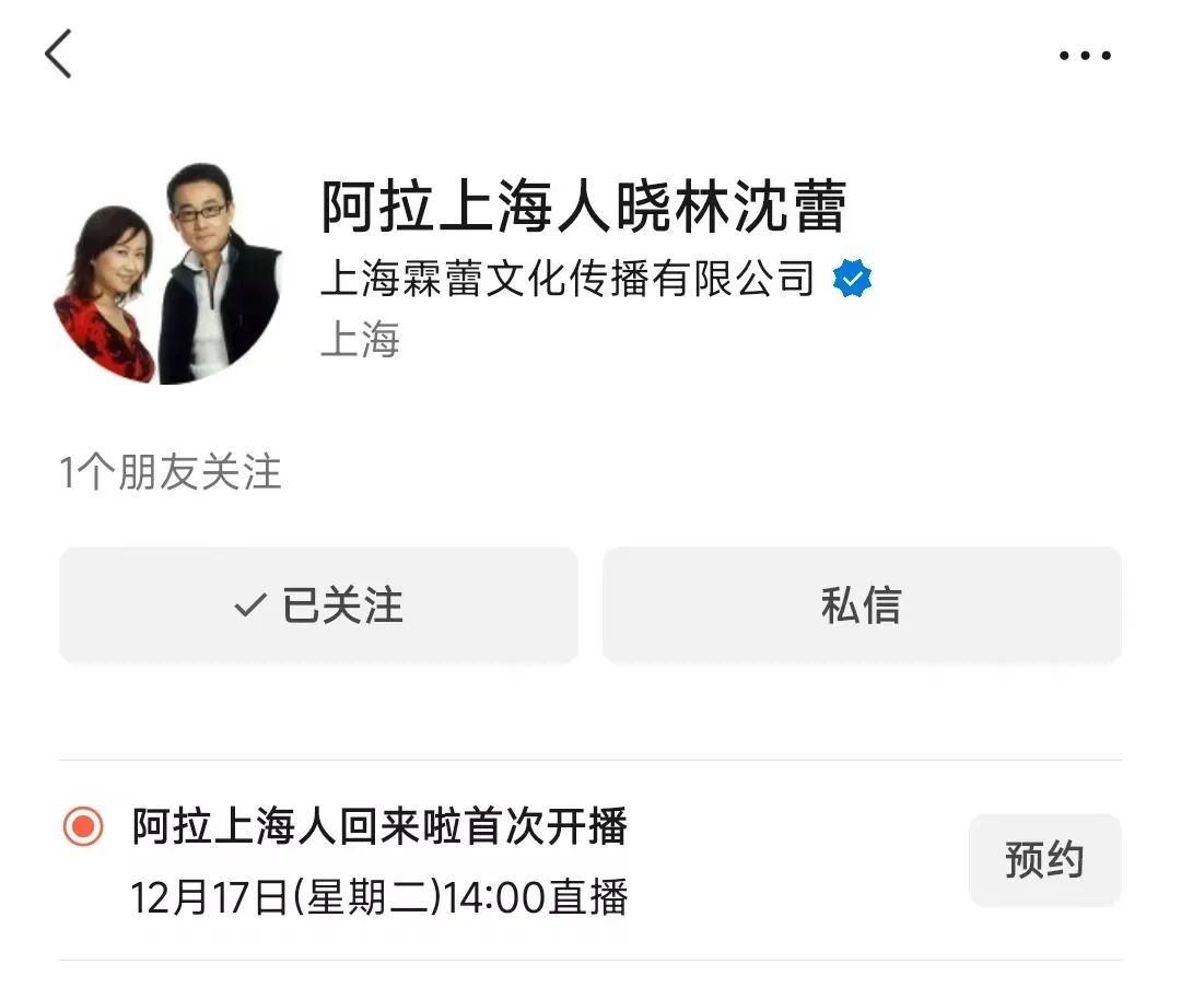 记者获悉,自12月17日起,每周二下午2点,《阿拉上海人》将在新的自媒体平台“阿拉上海人晓林沈蕾”视频号重新回归开播,前4期直播将在海梦一方举行。
