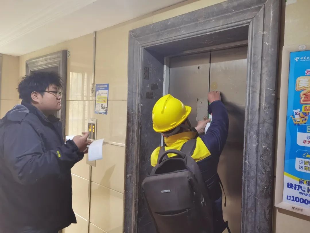 12月11日下午,在远香舫新苑小区13号楼的楼道内,电梯维保人员正在电梯门上张贴新的用梯安全提示。居民林先生告诉记者,以往每次在新闻里看到电梯关人的事故后都感觉很焦虑,“这次电梯做了一次全面检查,完成安全评估后,大家乘坐电梯放心多了!”