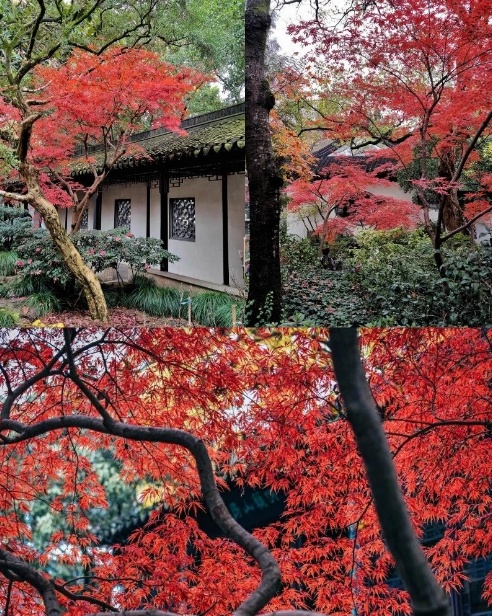 走进曲水园,便能看到凝和堂以及假山石边的红枫,红叶似“火炬”般,一簇簇、一团团,点缀在葱茏的绿树之间,随风摇曳,如火如荼,灿若红霞,展现出一派万木霜天红烂漫的绚丽景色。