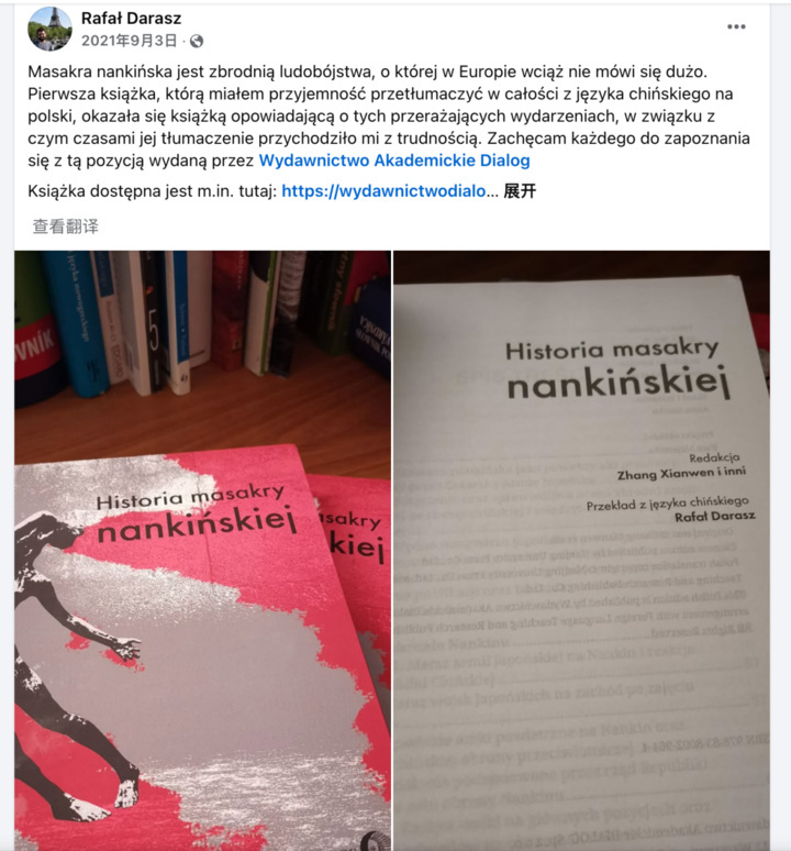 《南京大屠杀史》波兰文版译者通过社交媒体推荐此书。