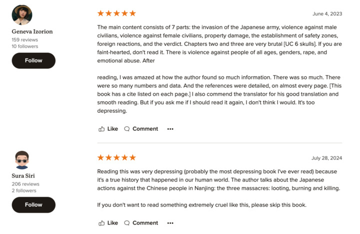 在被国内网友称为“美国豆瓣”的全球最大在线读书社区Goodreads,海外读者为《南京大屠杀》多语种版本写下了这样的书评。