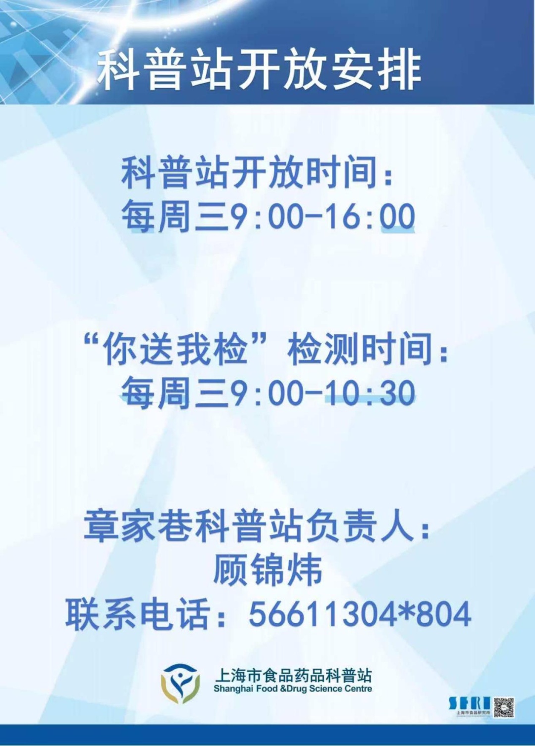 科普站位于延长西路526弄32号(章家巷社区服务站)二楼,站内设有科普展示区 、科普阅读区、食品快检区、互动体验区以及咨询投诉区。通过定期举办线下宣传教育活动如科普讲座、有奖答题、“你送我检”等方式,以提高街道居民对食品药品安全的认识。