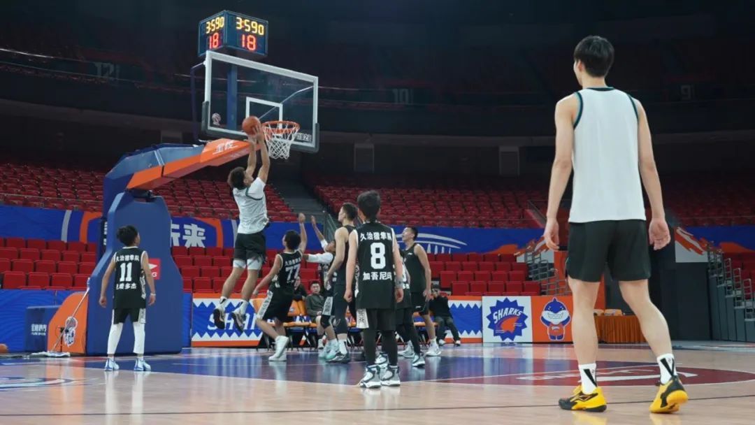 “球给我!”呼喊声在球场上空回荡,大鲨鱼队的职业球员们个个身材魁梧、技术娴熟,如同篮球场上的巨人,每一次运球、突破都显得那么从容不迫,展现着职业球员的风采。