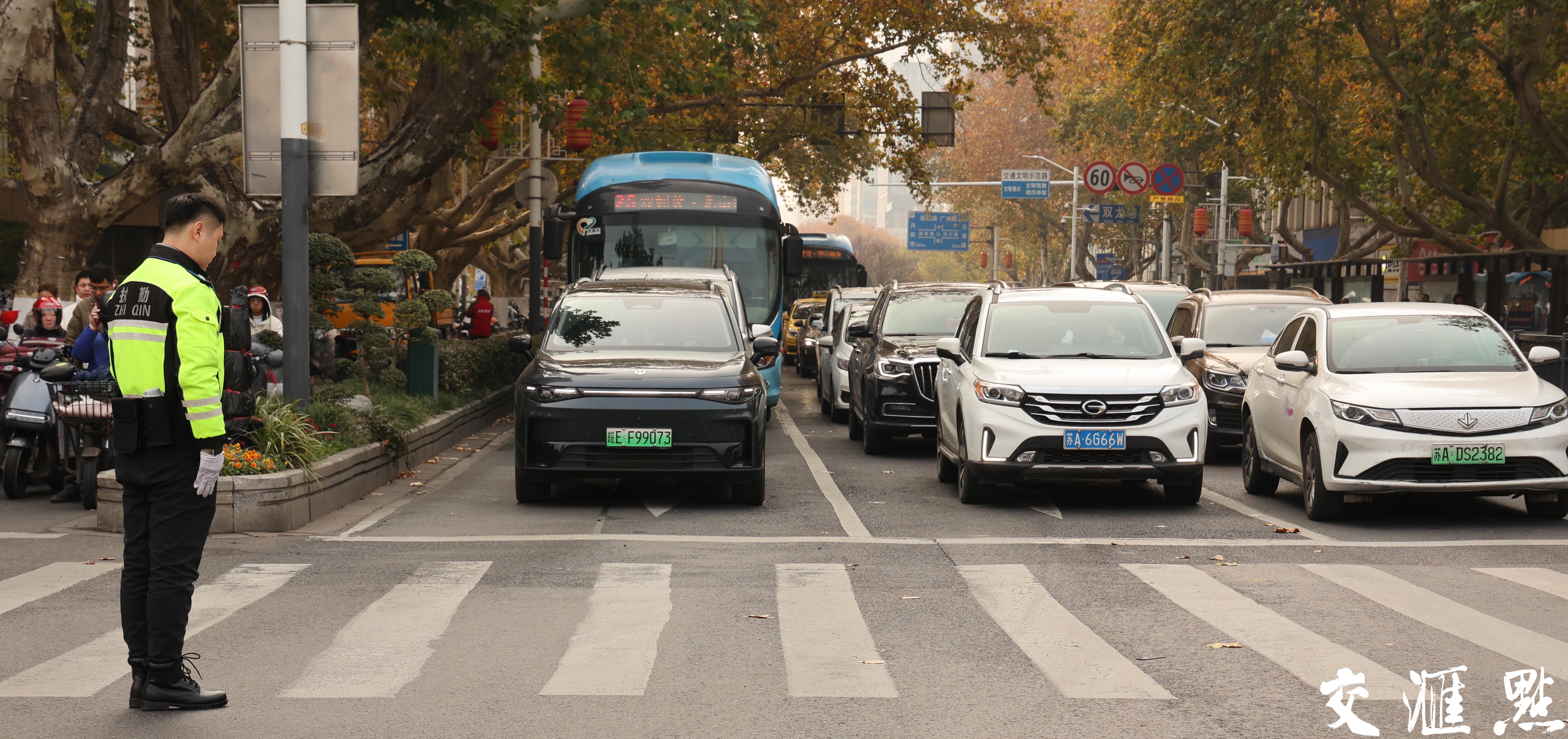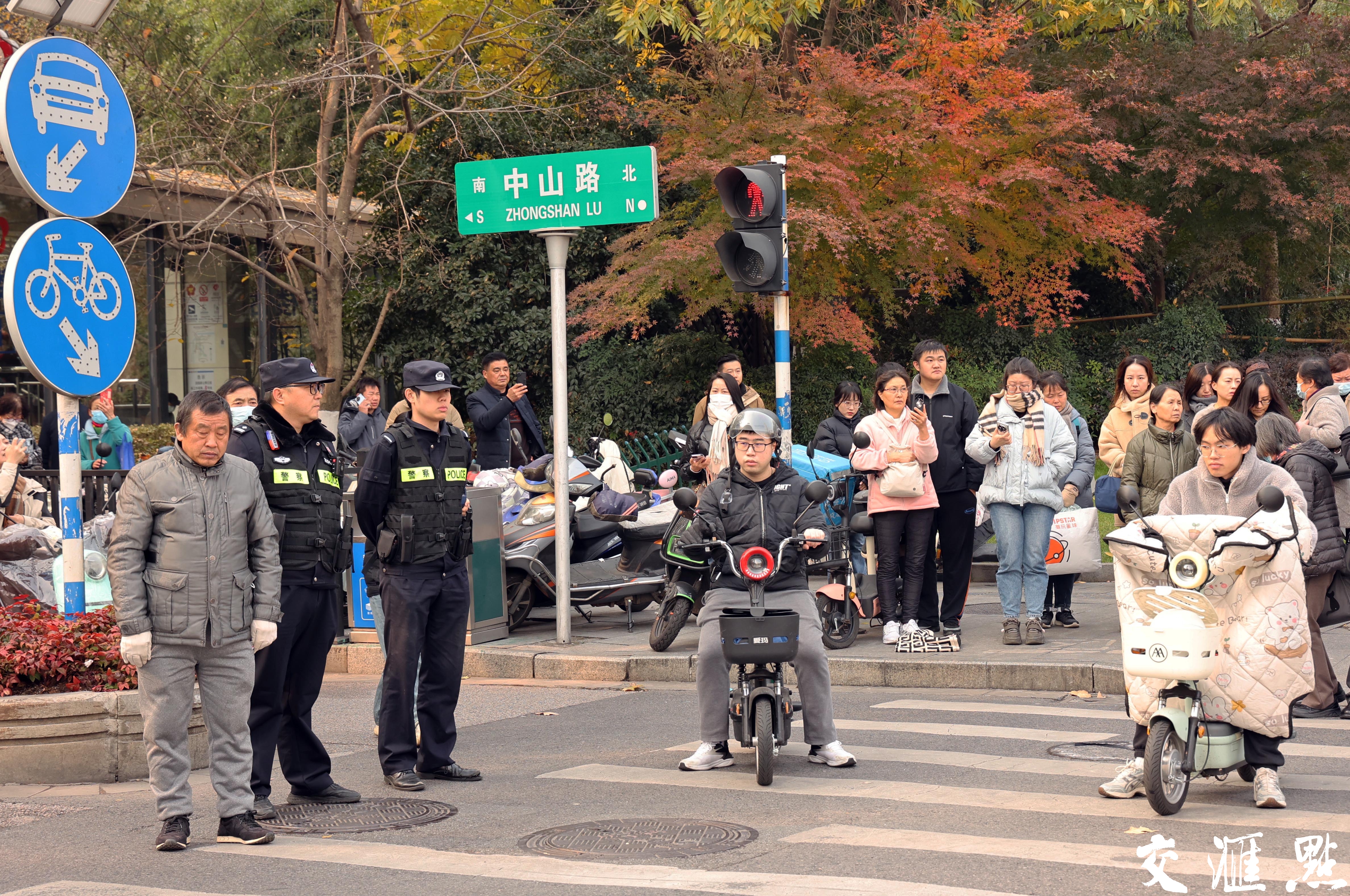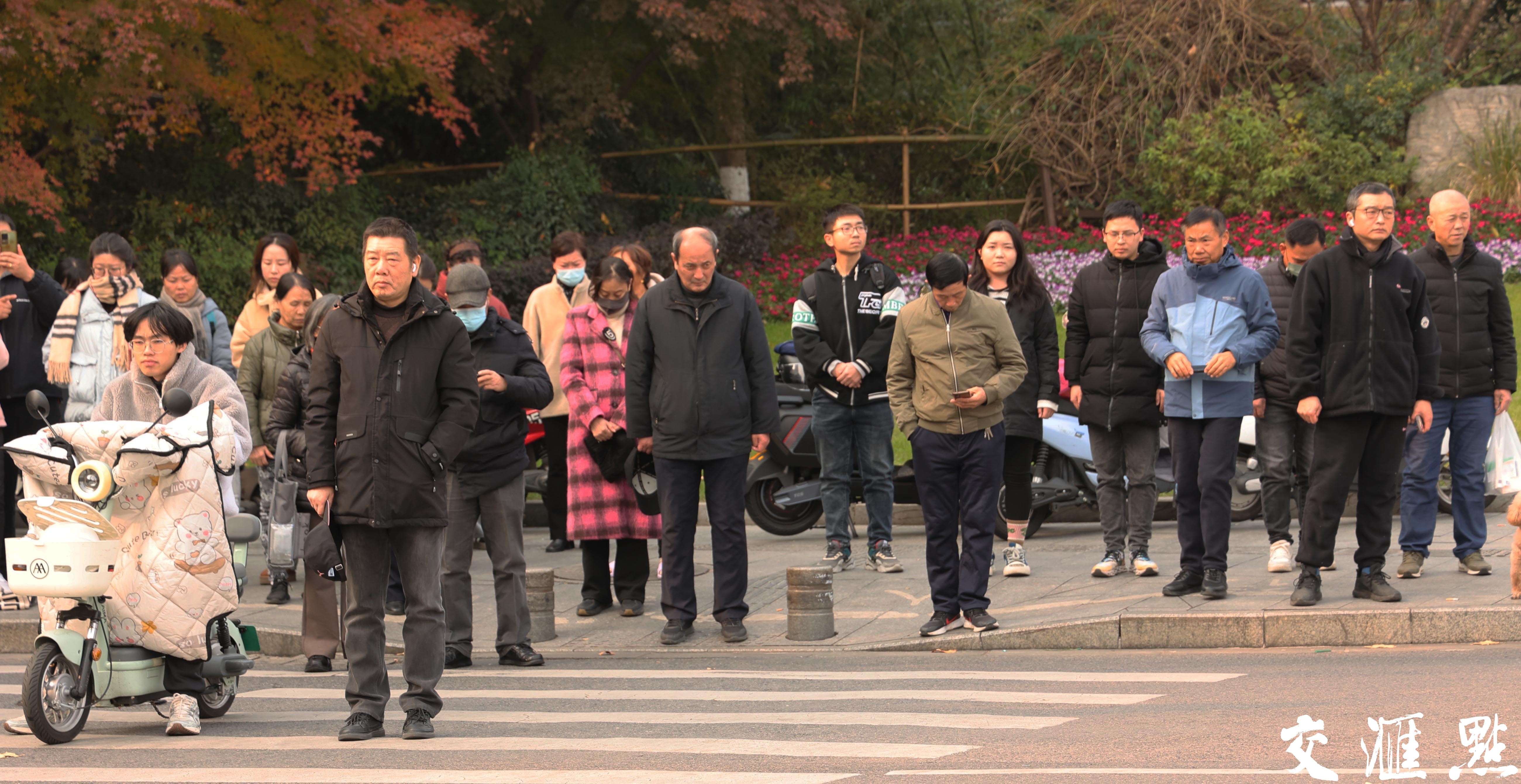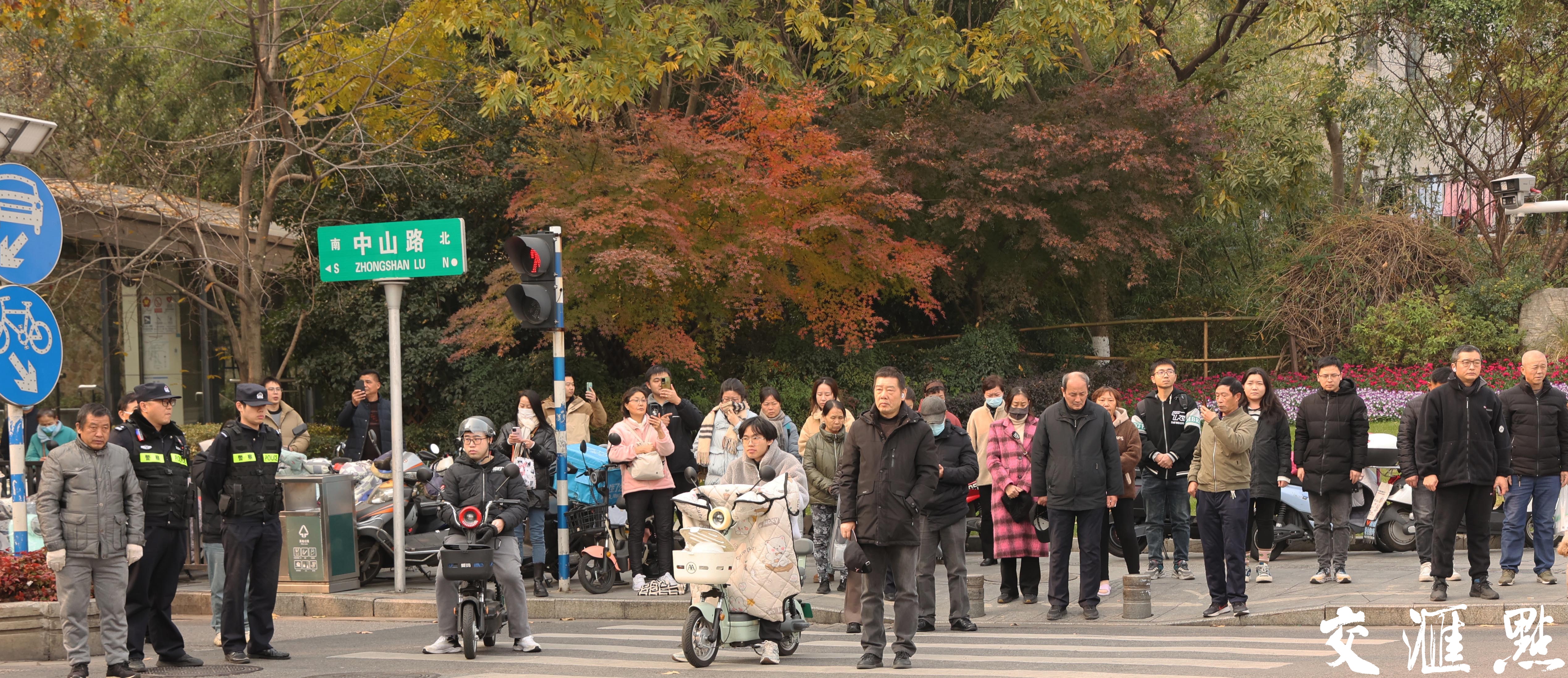 2024年12月13日,南京大屠杀死难者国家公祭日。上午10时整,南京全城鸣响防空警报,街头执勤的民警和出行的市民驻足默哀,哀悼遇难同胞。 新华日报·交汇点记者 宋宁 摄