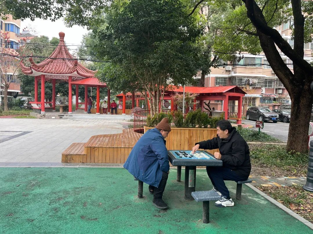 上午9点,西渡街道果园小区的中心广场上人慢慢多了起来。下了几天雨,大家就一直盼着雨停,赶紧出来一起“嘎三胡”。经过两个多月的微改造,广场12月份终于对大家开放了,可谓是焕然一新。