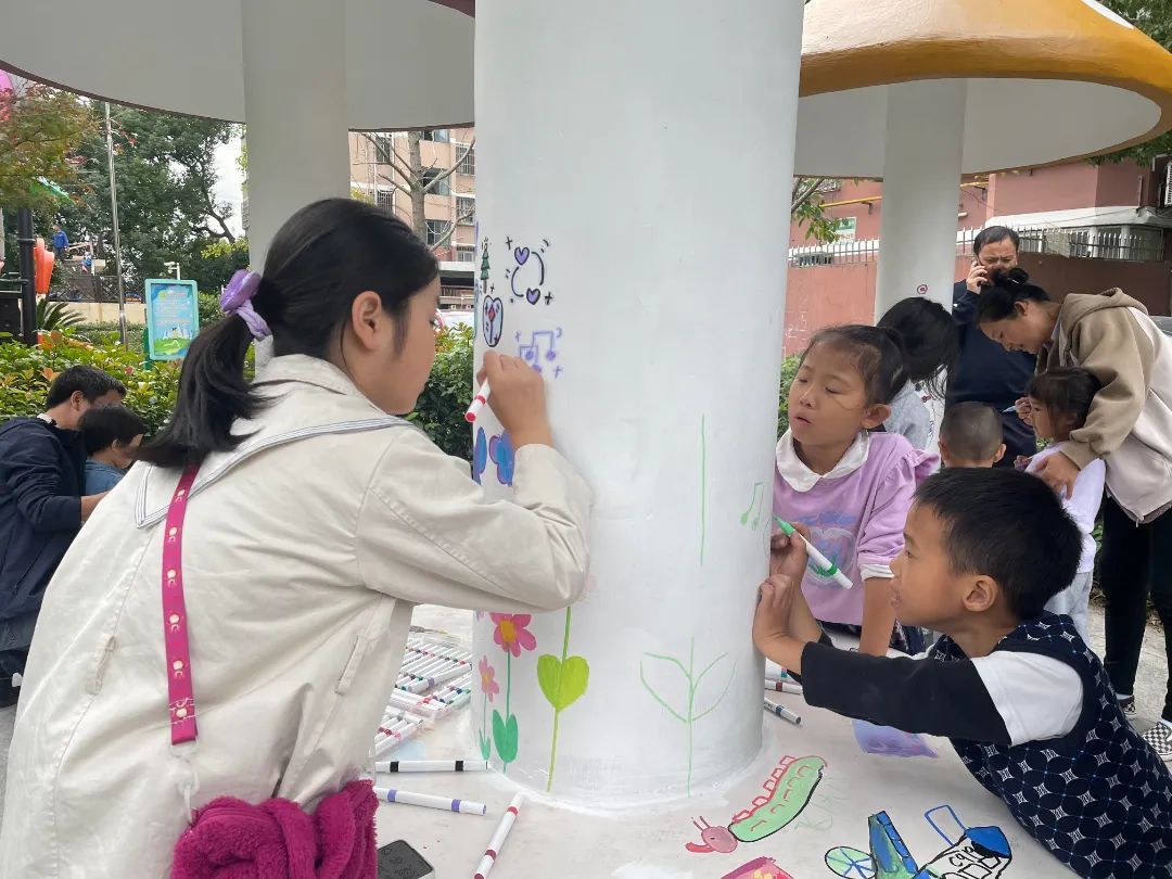 居委会工作人员表示,果园小区业委会每月会召开一次议事会,听取居民意见、集思广益讨论解决小区问题。秋天的时候,有居民提出,亭子内部可容纳人数有限,时常需要延伸到小广场上,但广场上也没有可坐的地方,花草杂乱,儿童区域设施也非常陈旧,孩子们都不愿意去玩。经过大家的商议,社区微改造被提上了议程。而且居民们还是全程参与,一起商量,一起监工,有的居民还捐献了大量绿植,主动美化花园。孩子们也不甘示弱,一起参与了儿童区域的改造。比如全新的蘑菇亭柱子上,充满童趣的图案都是小朋友自己亲手画的。
