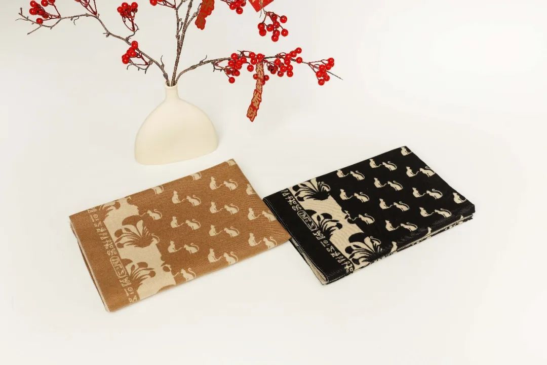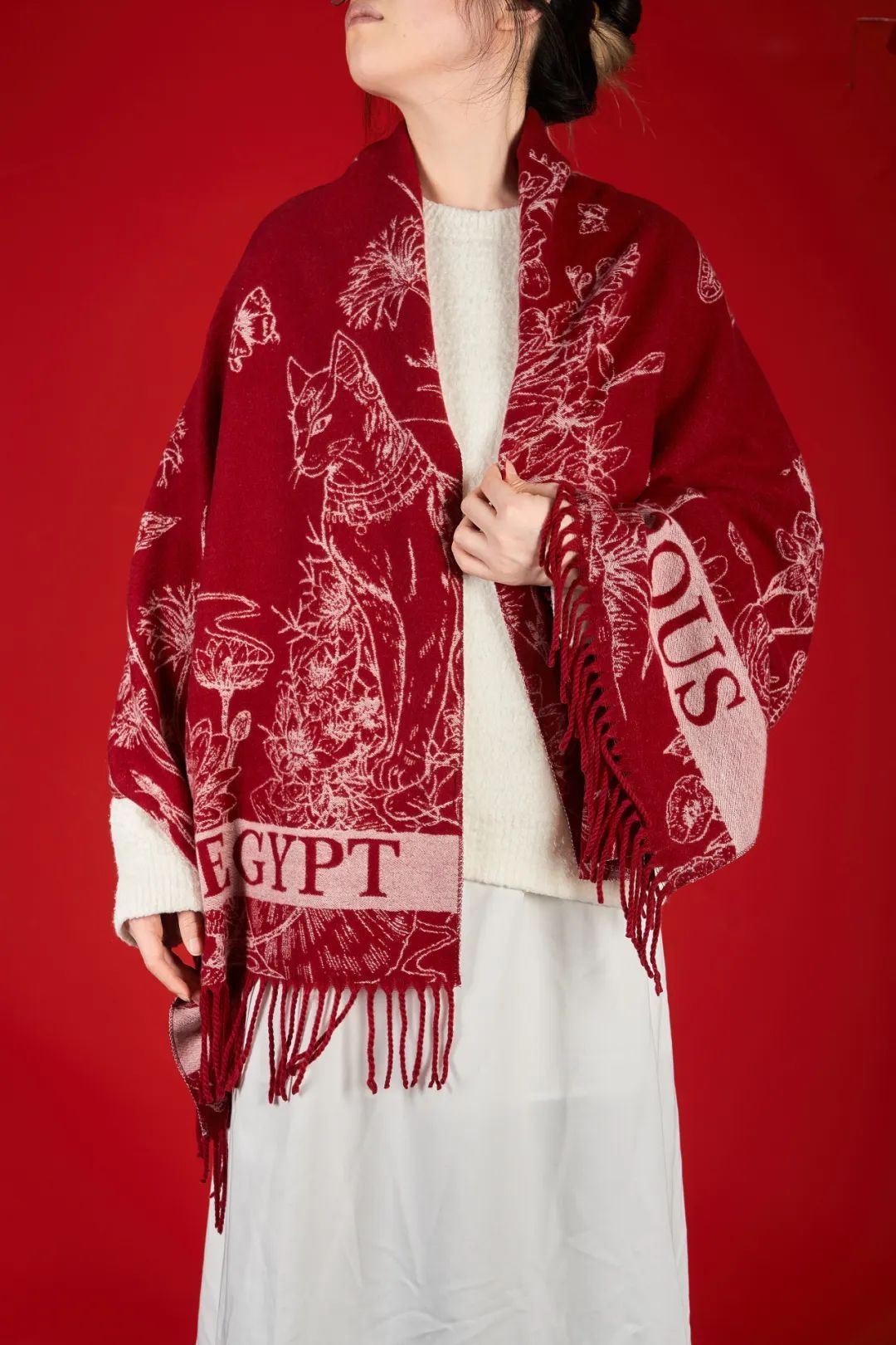围巾以古埃及文化为主题,色彩沉稳大气,围巾如羊绒一般温暖,手感舒适,也可做为披肩,适配多种造型。