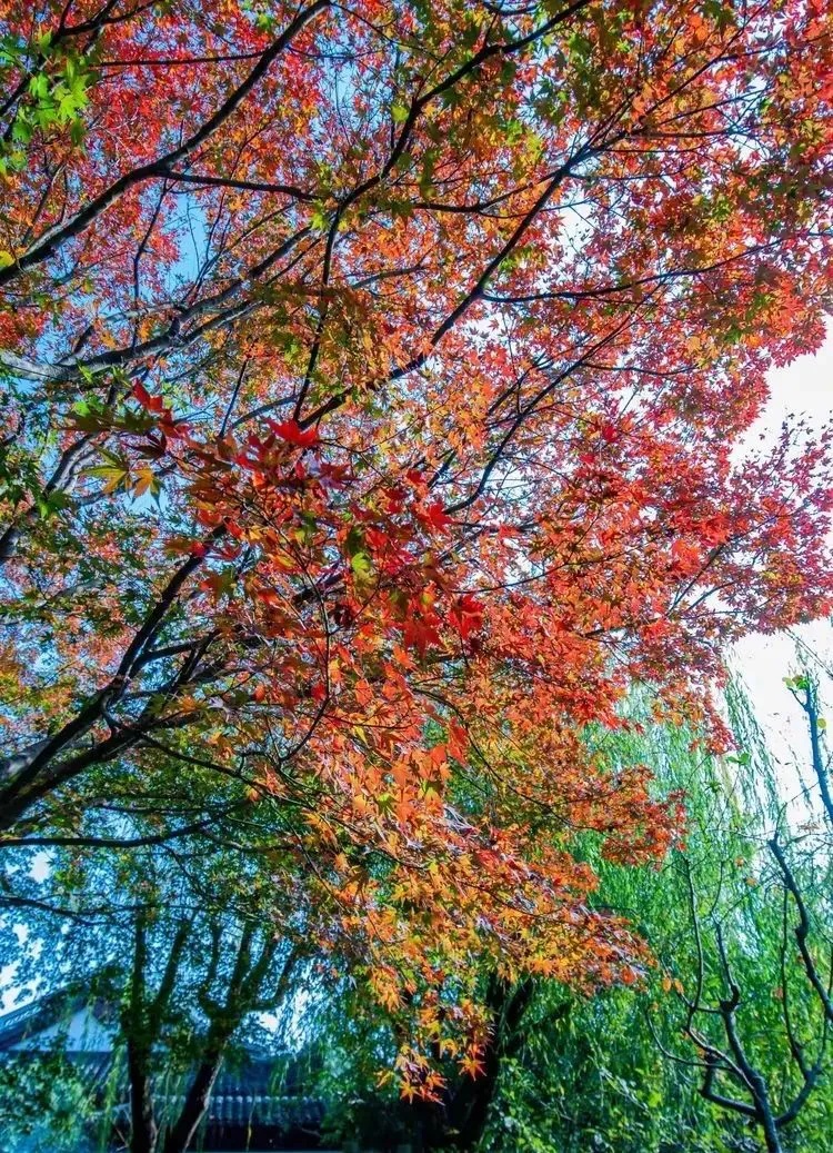 作为五大古典园林之一的秋霞圃,此时到处充斥着浓烈又绚烂的色彩,各种变色叶片的色彩碰撞,呈现出别具一格的江南园林色彩美学。