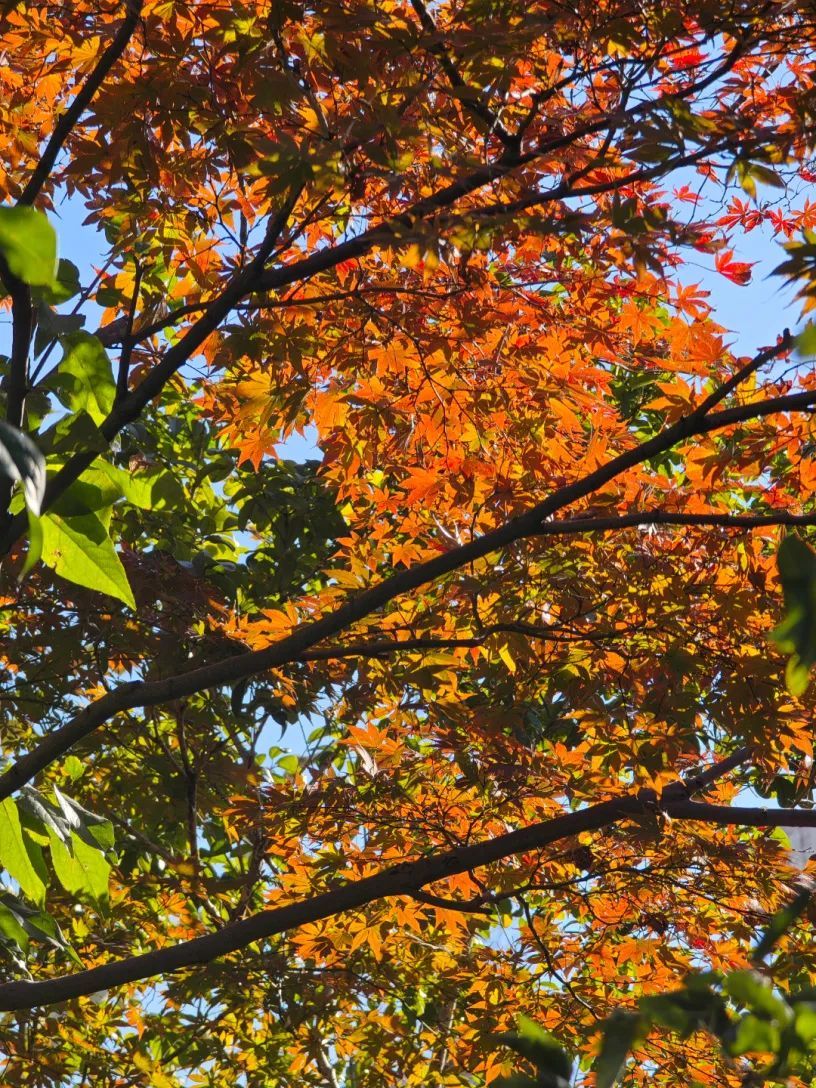 走进曲水园,便能看到凝和堂以及假山石边的红枫,红叶似“火炬”般,一簇簇、一团团,点缀在葱茏的绿树之间,随风摇曳,如火如荼,灿若红霞,展现出一派万木霜天红烂漫的绚丽景色。