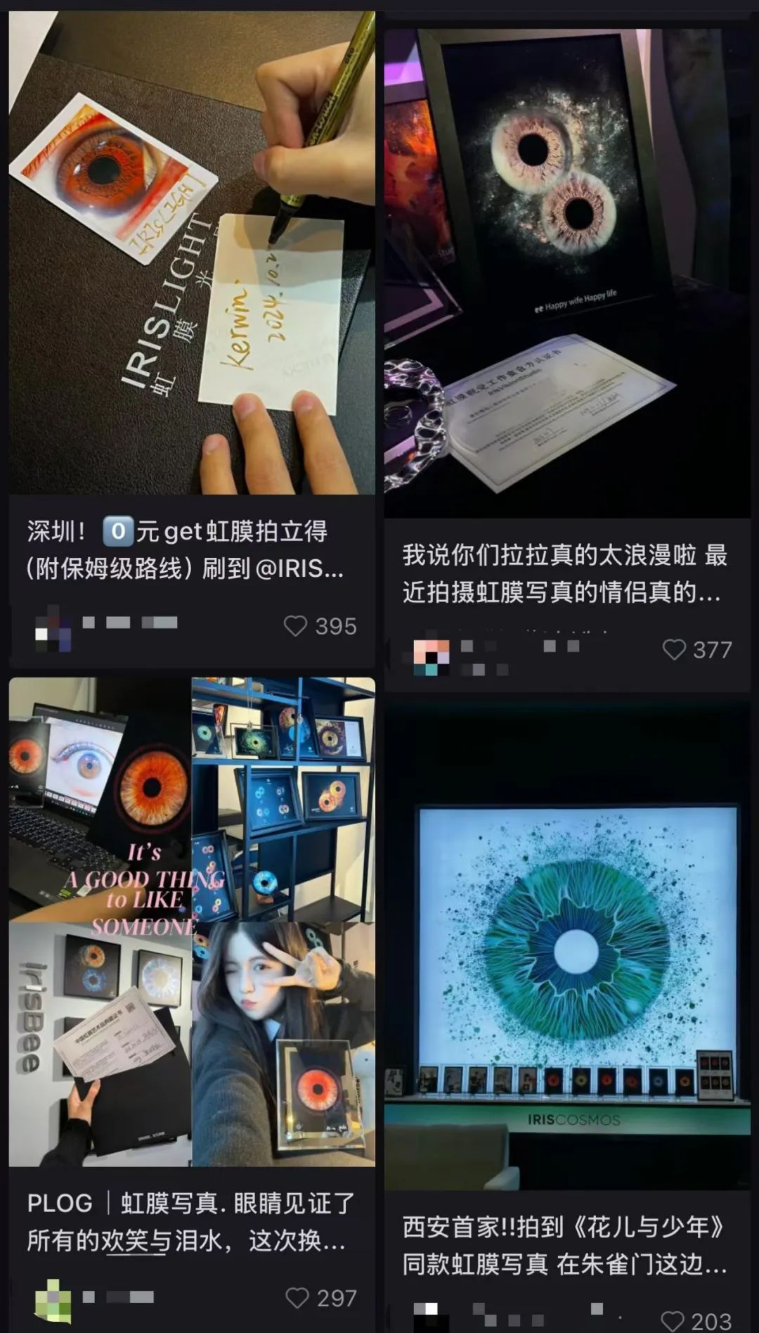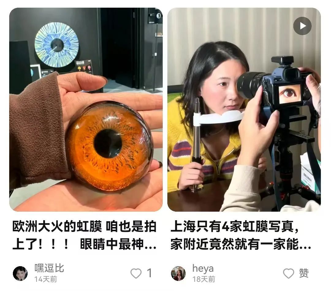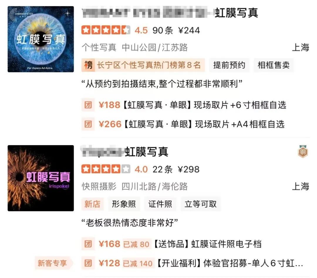 近日,“虹膜写真”在年轻人中间走红。搜索探店分享平台,上海就有多家体验门店。团购套餐显示,可拍摄单瞳、双瞳、情侣/闺蜜、全家福,价位不等↓↓
