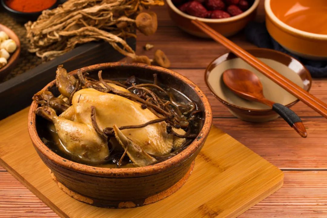 鸡肉含有丰富蛋白质和氨基酸,可缓解虚劳、促进新陈代谢、增强免疫力。茶树菇含有多糖、B族维生素、铁元素和膳食纤维,能够改善贫血和肠道功能。