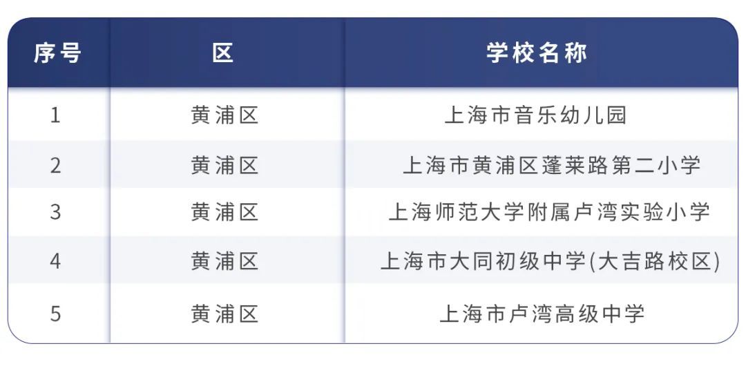 近日,上海市教委公布了“首批上海市儿童友好学校试点校”的名单,共有61所学校入选。其中包括上海市音乐幼儿园、黄浦区蓬莱路第二小学、上海师范大学附属卢湾实验小学、上海市大同初级中学(大吉路校区)、上海市卢湾高级中学等5所黄浦学校。