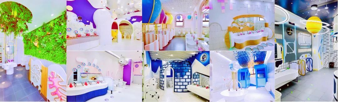 盥洗室创意十足,融入了生活习惯养成、探究兴趣萌发、环保理念内化等理念。如为低幼孩子打造的热气球、兔乐园、云朵屋等盥洗室,给予孩子自我如厕时足够的安全与温度。置身蓝色系的水世界,孩子不仅能看到废水循环利用和水利发电的科技亮点,还能运用电子雾化玻璃保护隐私。在乐精灵的大耳机样式洗手台前,孩子们可唤醒天猫精灵,让美妙旋律陪伴整个盥洗过程。绿森林、太空站、科考站中,感应光带、半透明 “雪屋” 暗示孩子们学会等待与守规。