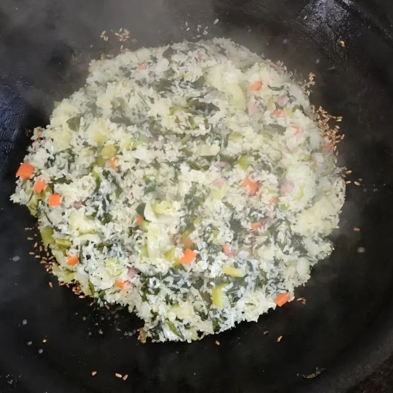 锅盖一开,一股咸香扑鼻而来,粒粒分明的米饭,像是珍珠撒在绿毯上;软糯香甜的青菜,如同绿宝石般诱人;咸鲜适中的咸肉,犹如金子般熠熠生辉。