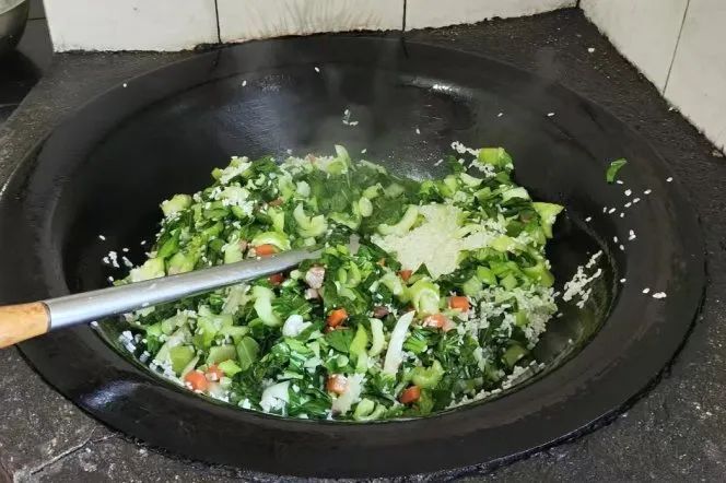 烧完砵肉的灶间又重新“开造”。倒入菜籽油,下咸肉翻炒,再放切好的青菜、胡萝卜,继续翻炒,最后放入淘好的新米,翻拌均匀,就可以盖上锅盖,此时灶间已经弥漫着诱人的菜香气了。这是一场关于咸肉菜饭的盛宴,令人翘首以盼。
