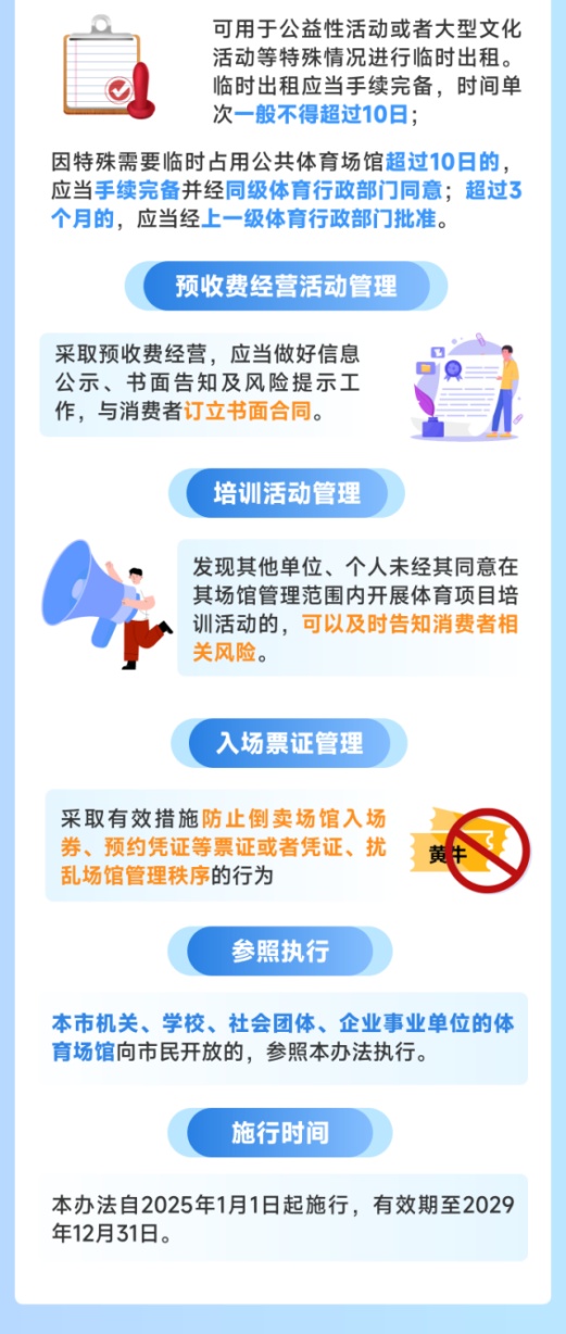 近日,上海市体育局印发《上海市公共体育场馆开放运营管理办法》,自2025年1月1日起施行,有效期至2029年12月31日。《办法》旨在进一步加强公共体育场馆安全管理,提升公共服务效能。小编带你一图读懂!