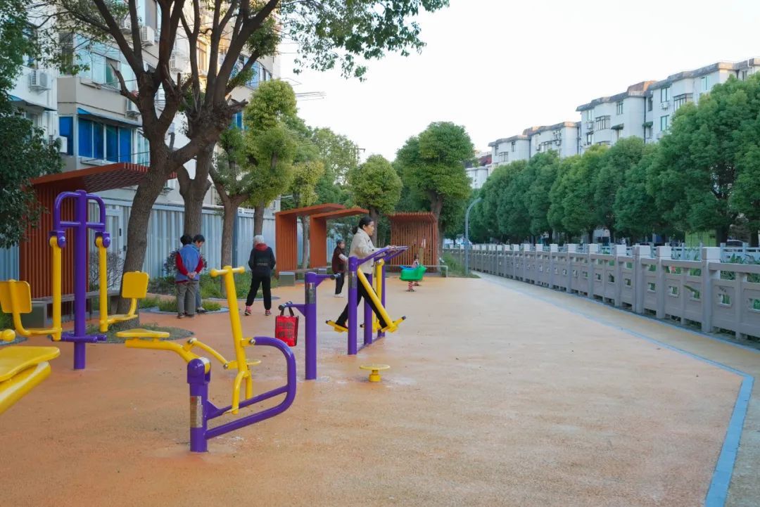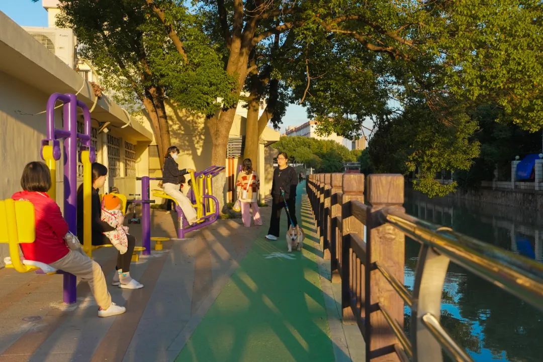 走出迎园六七坊,穿过迎园路,便来到一片蓬勃朝气的橙色天地,这是今年完工的迎园五八坊沿河口袋公园。这座滨水公园分段设置功能性区域,由一条鲜亮的黄色步道连接。河岸旁的健身休闲区域,常有老人们在此三三两两闲谈,孩子们追逐跑跳。