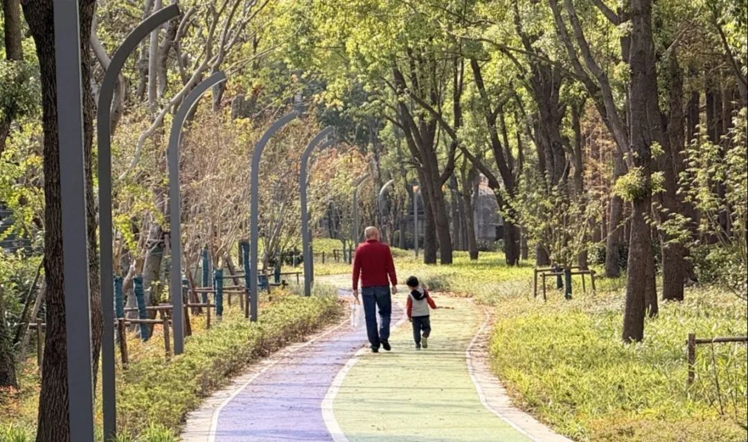 练祁河南岸是嘉定中心城区环道的外接延伸,其整体提升项目也已完工。项目东至澄浏中路、西至新成路,全长约1公里。完整的滨水绿道漫步系统贯穿项目场地,形成东西方向景观轴和滨水体验生态廊道,串联起三处生态滨水公共开放空间。