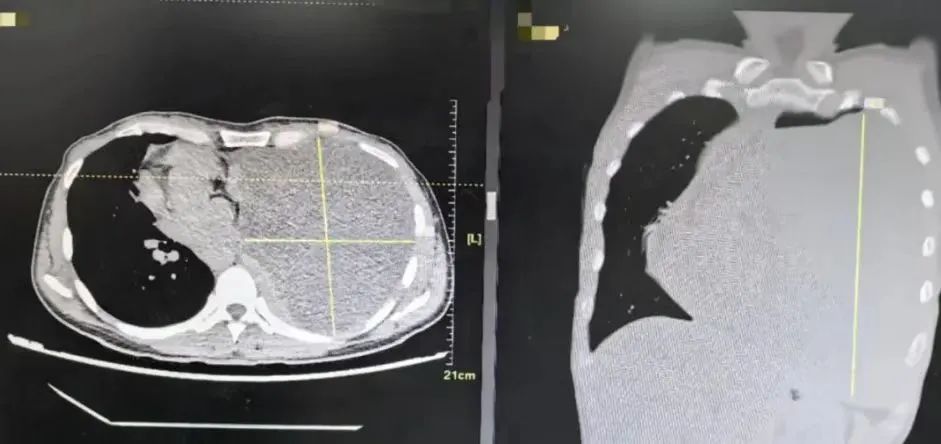 于是,在家人的陪伴下,刘女士前往福州市第一总医院呼吸与危重症医学科就诊,经肺部CT检查发现:肿瘤左侧胸腔内巨大占位,几乎占据整个左侧胸腔,心脏气管严重受压移位。