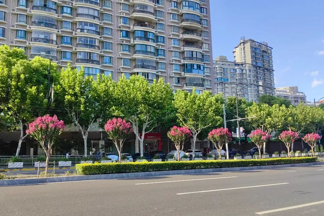 东长治路(新建路—溧阳路段)全长约 650 米,绿化景观层次分明、别具一格。道路两侧为悬铃木,中隔带种植了天鹅绒紫薇和茶梅柱,地被植物以风雨兰 “胖丽丽”点缀其间,共同编织出“多季有花、一季有色”的景观效果。