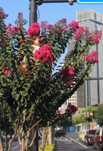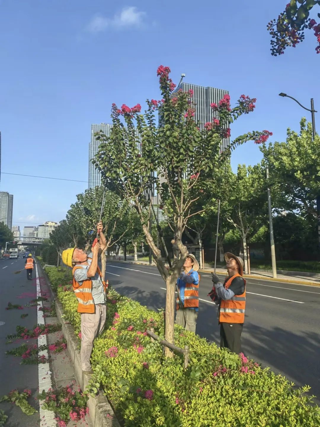 “天鹅绒紫薇的养护是一大亮点。”黄岩明介绍,“我们对天鹅绒紫薇采用了二次控花技术。在紫薇第一次开花后,我们会根据气温情况,通常在8月中下旬,及时剪除花序及幼果,并加强水肥管理。经过大概一个月的分化后,可形成新的花芽,从而实现10月份之前再度开花,延长了紫薇的观赏期。”
