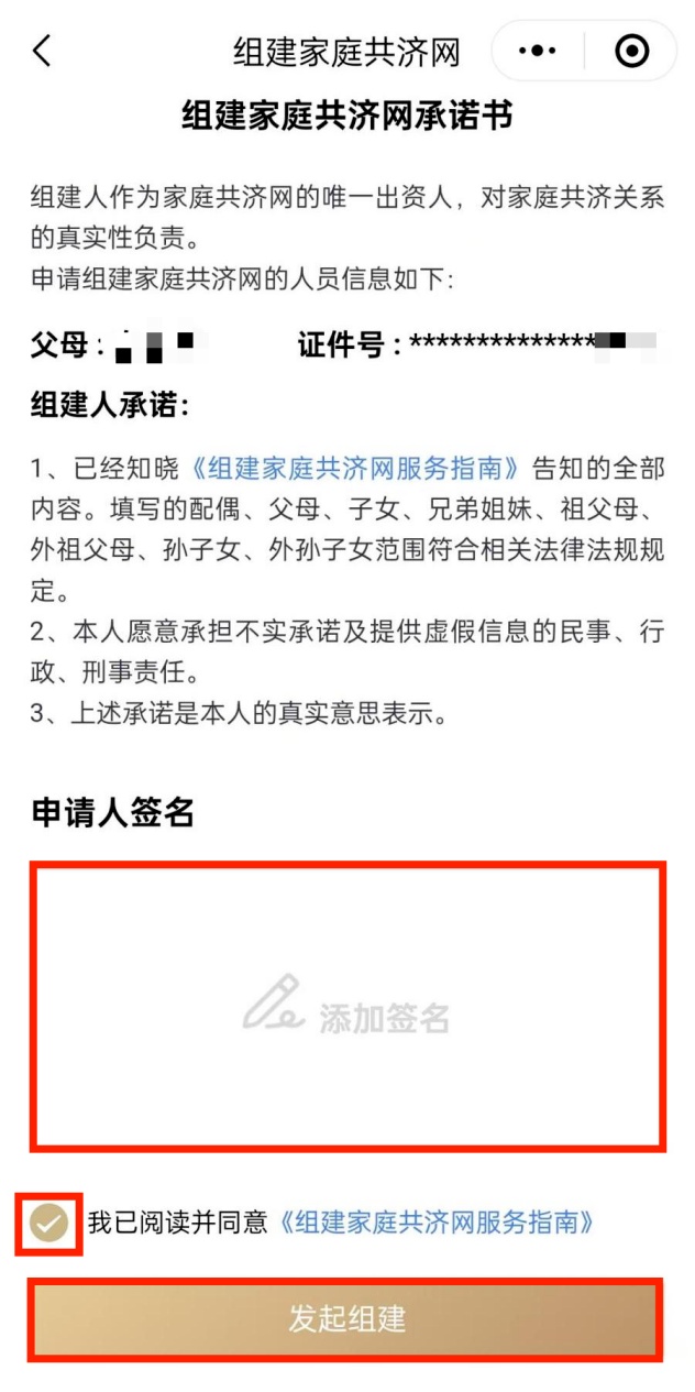 请务必详尽地审阅《组建家庭共济网服务指南》,并由申请人亲自签署姓名。在确认所有信息无误后,请勾选“我已阅读并同意”选项,点击“发起组建”即可完成组建。在组建完成后,您可以选择共济关系成员的共济方式(可同时选择两项),并点击“确认选择”。
